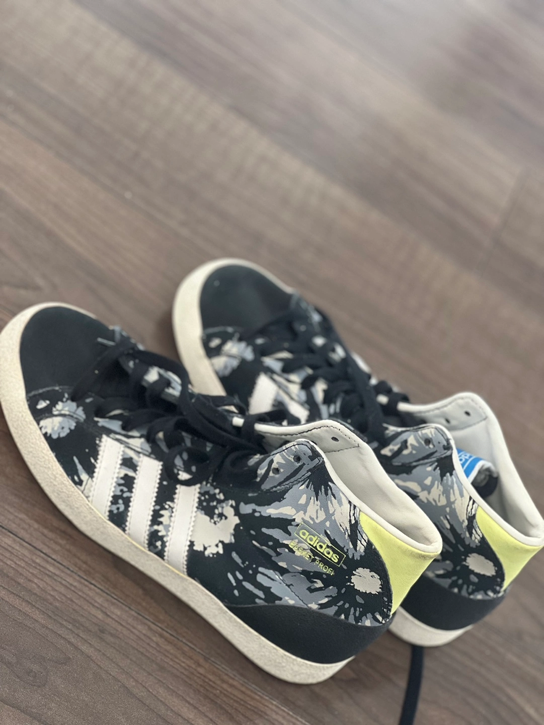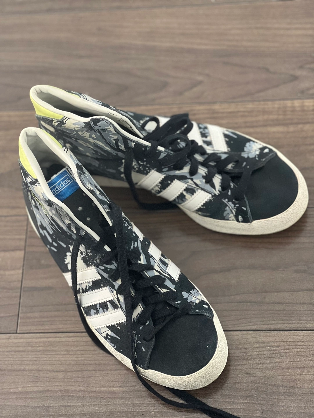 12Pair of Adidas high top sneakers. Black and grey floral print. White stripes. Off-white sole. Lace-up closure. Good condition.