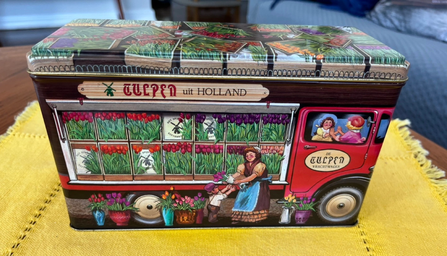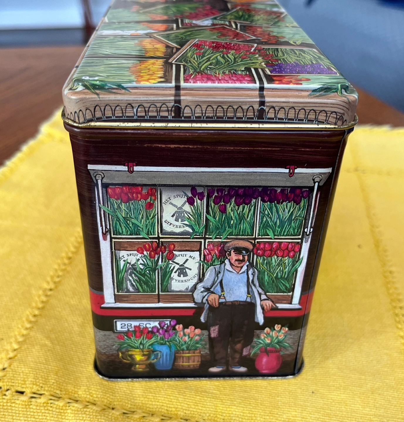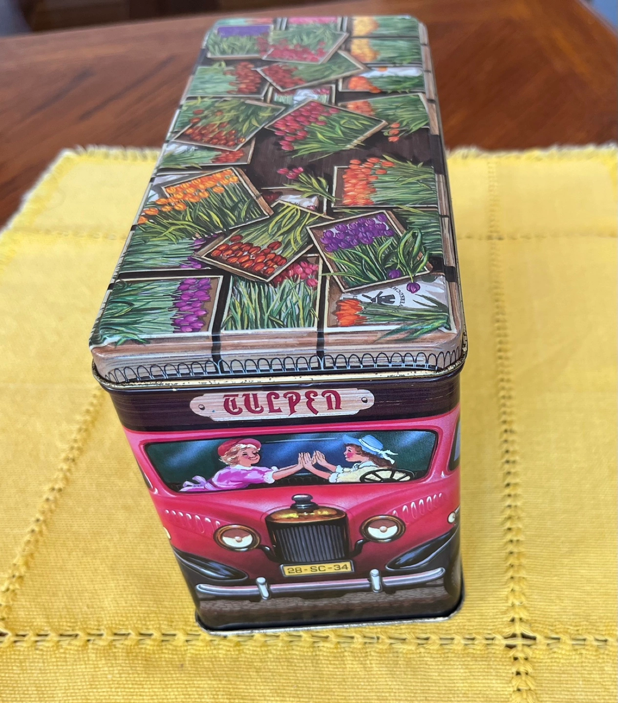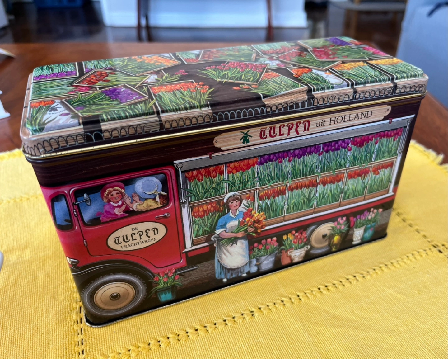 Collectible tin box. Features a charming vintage truck design. Ideal for storage or display. Made in England.