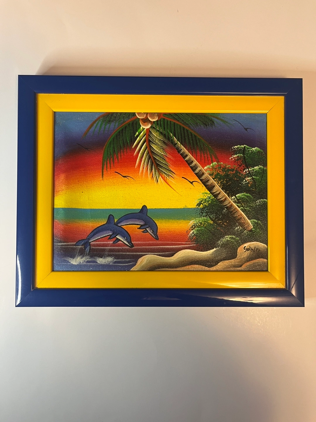 Small framed painting. Depicts dolphins jumping near a beach at sunset. Vibrant colours. Yellow and blue frame. Minor imperfections on frame.