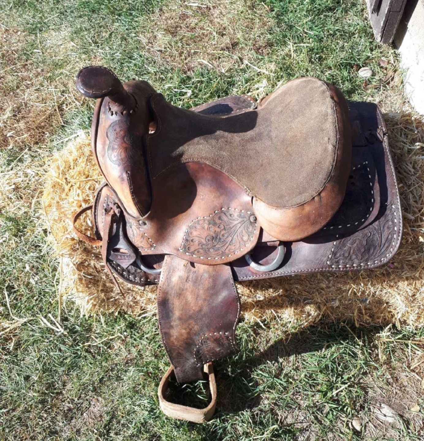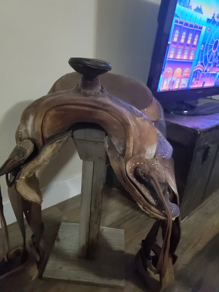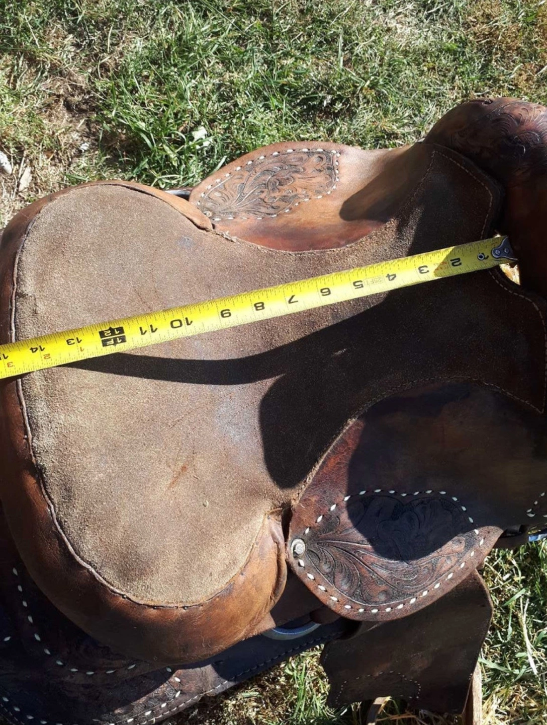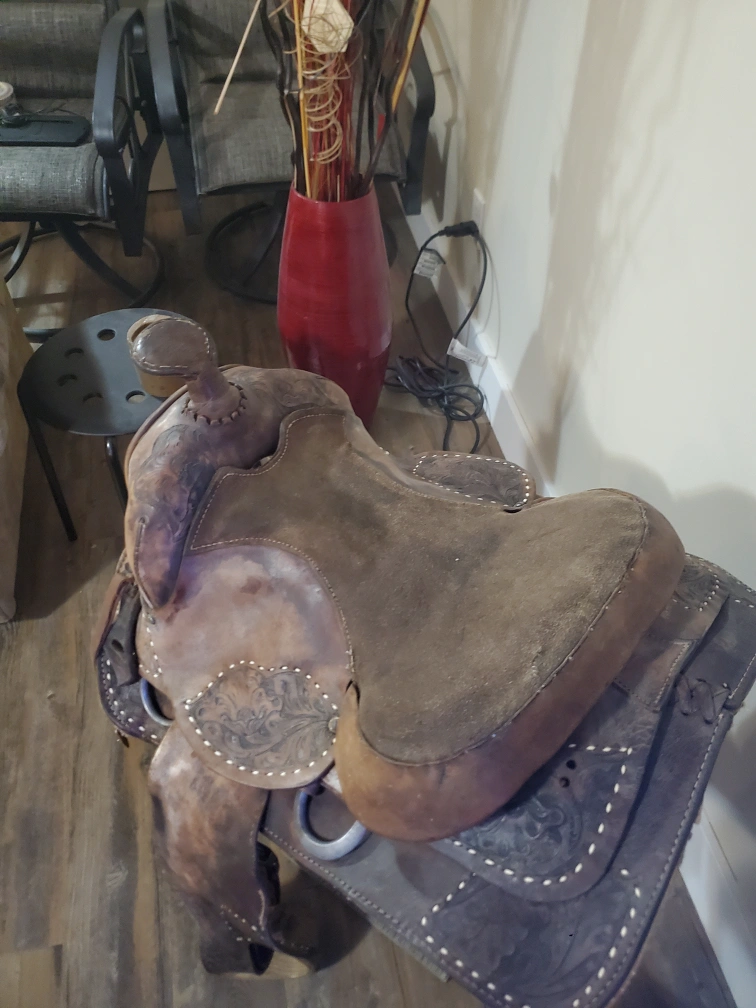 Used leather horse saddle. Shows significant patina Intricate tooling. Requires have been using it as home decor but moving ad don't have room to take it Measurements included in photos.