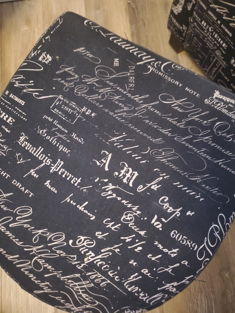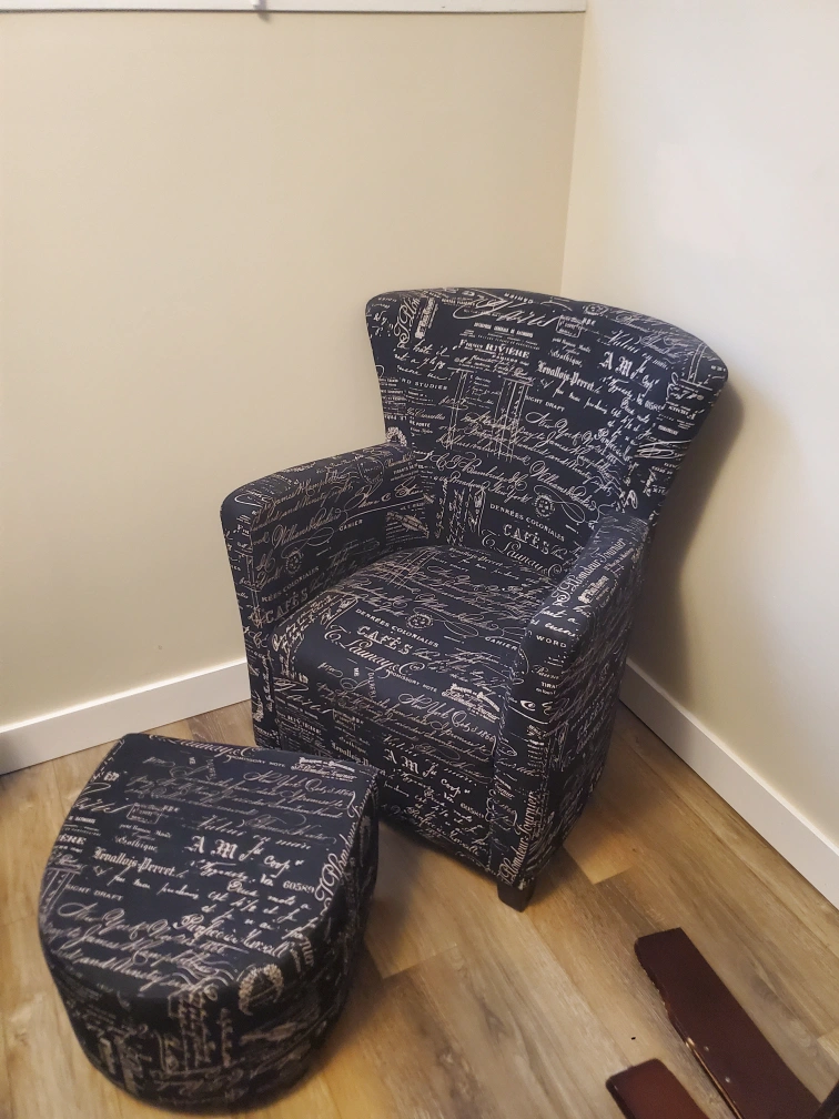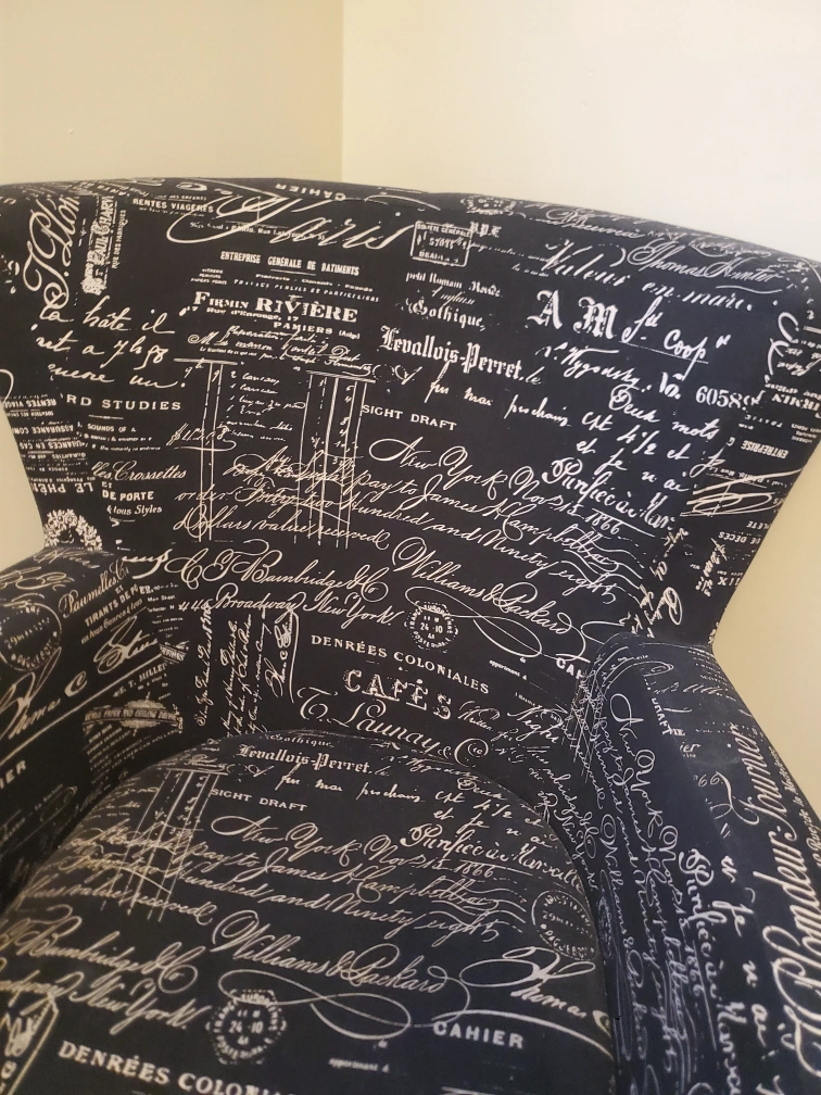 Elegant armchair and ottoman set. Dark fabric with white script print. Wingback style chair. Features wooden legs.