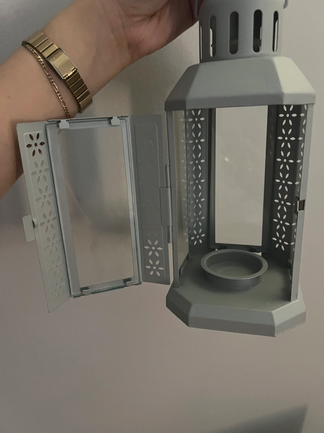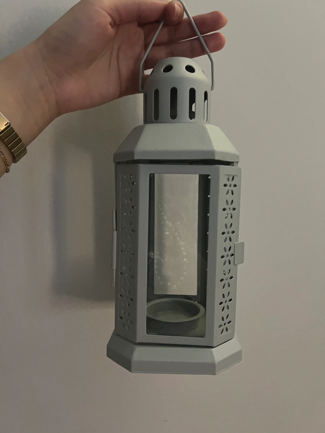 Small grey metal lantern with tags still on it.