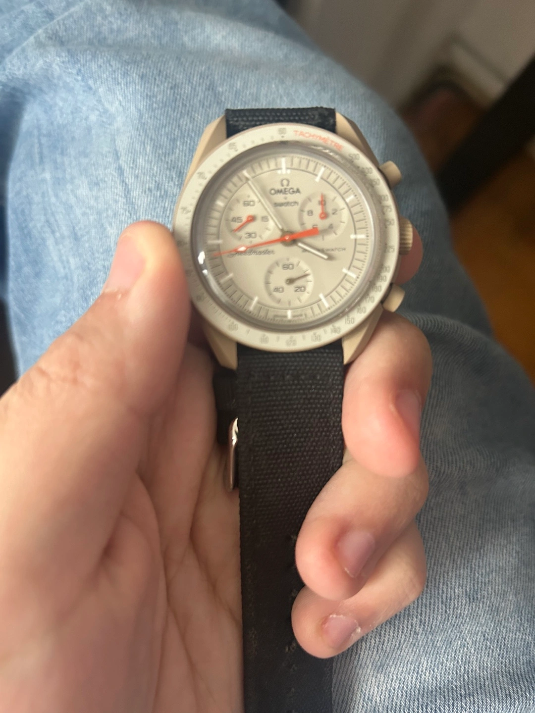 Omega x Swatch collaboration watch. Mission to Jupiter model. Beige coloured case and leather strap. Chronograph functions. Pre-owned like new condition.