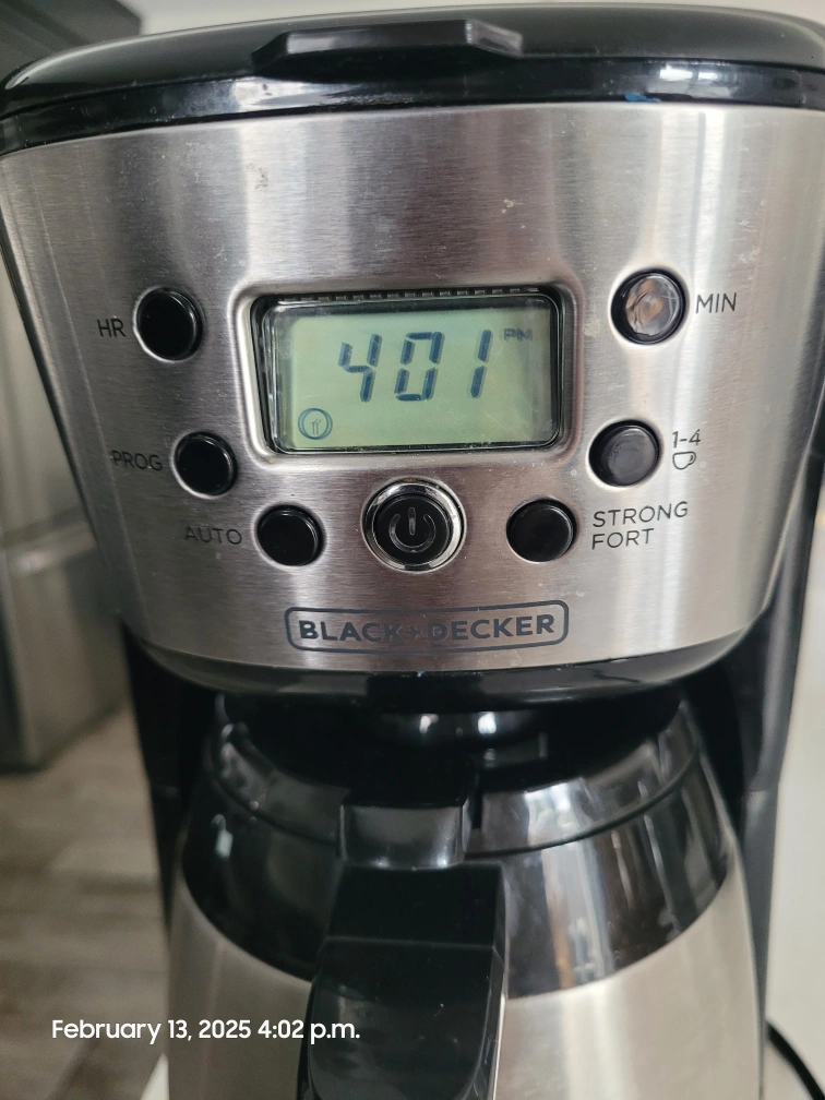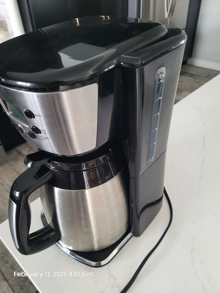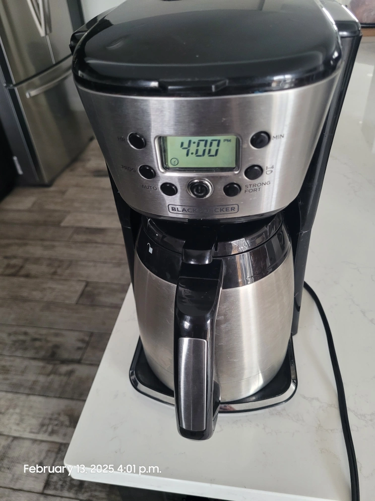 Programmable coffee maker. Stainless steel carafe. Digital clock and timer. Multiple brew strength options. Good condition.