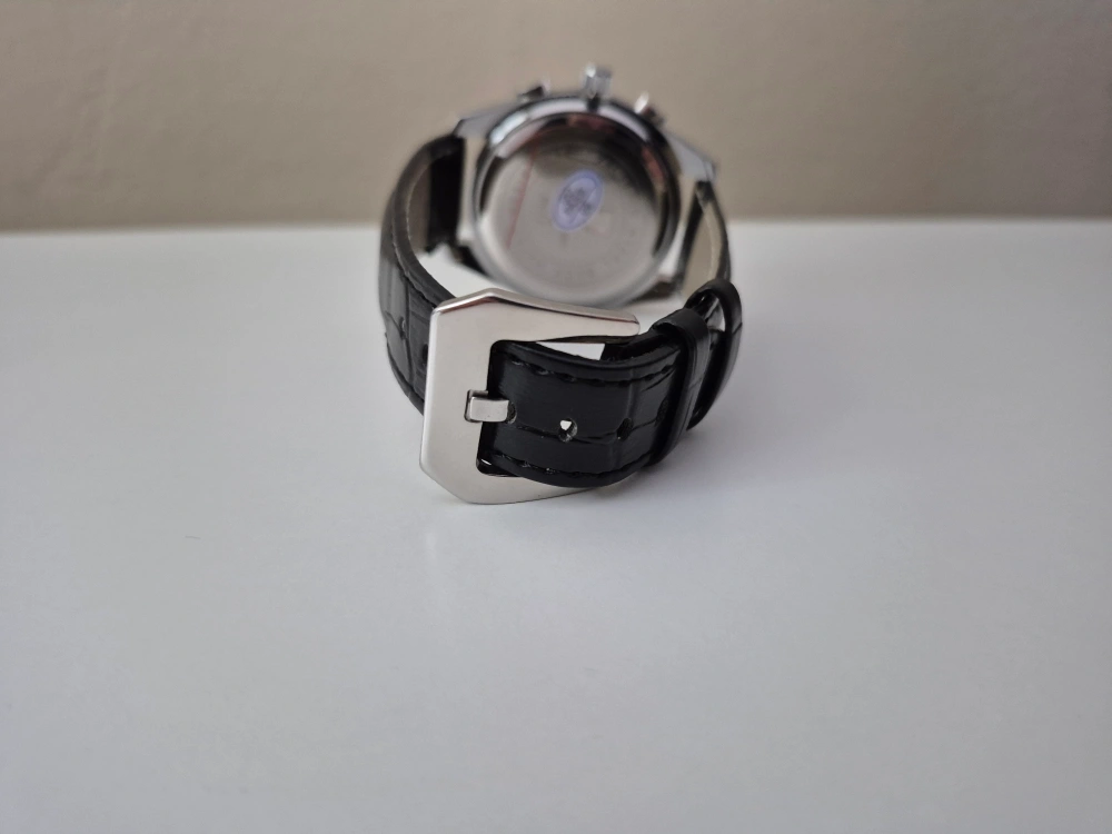 Elegant men's wristwatch. genuine leather band. Silver-toned casing, black face. Looks great and keeps accurate time.