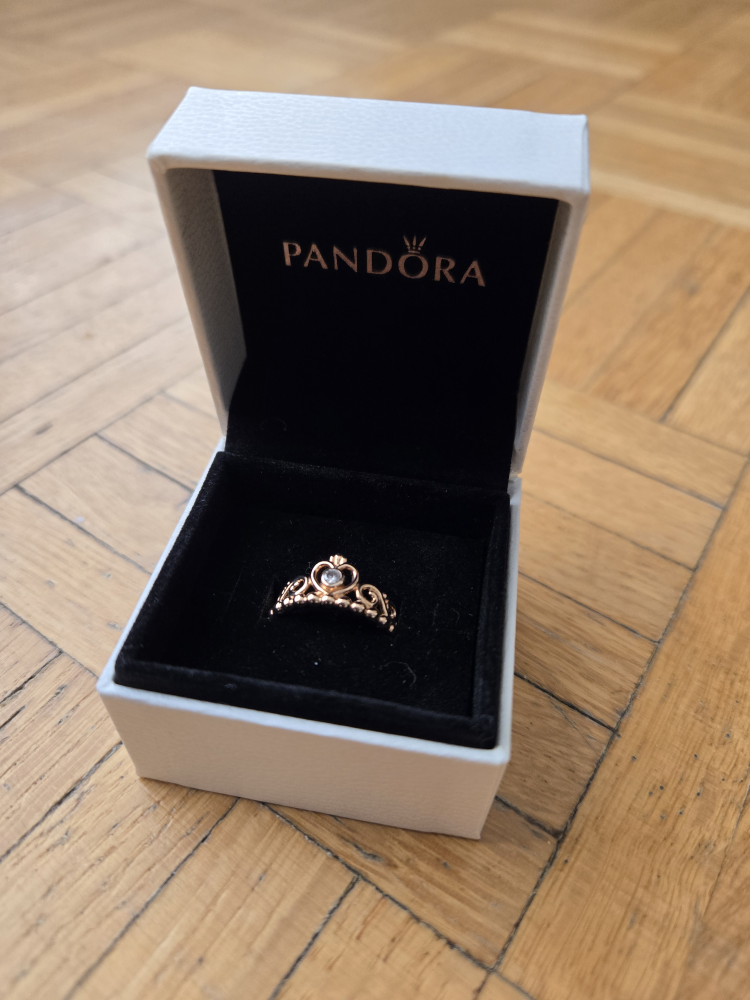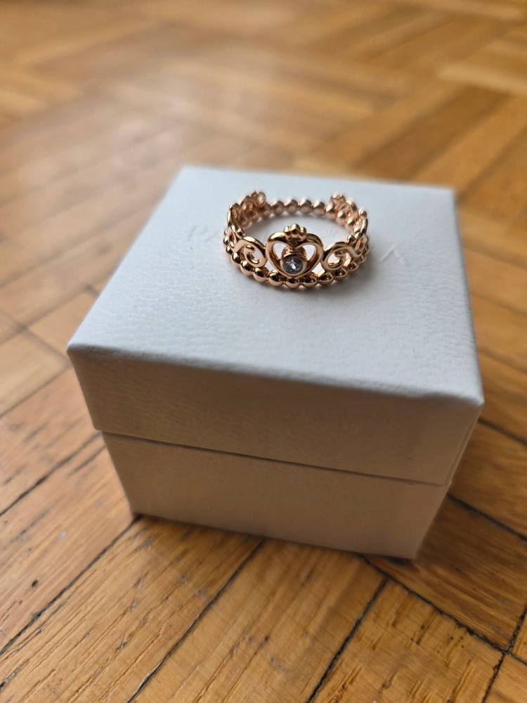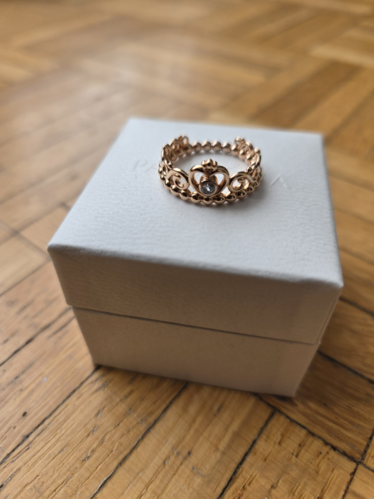 Beautiful rose gold princess crown ring. Features a small clear stone. Comes in original Pandora box and soft pouch