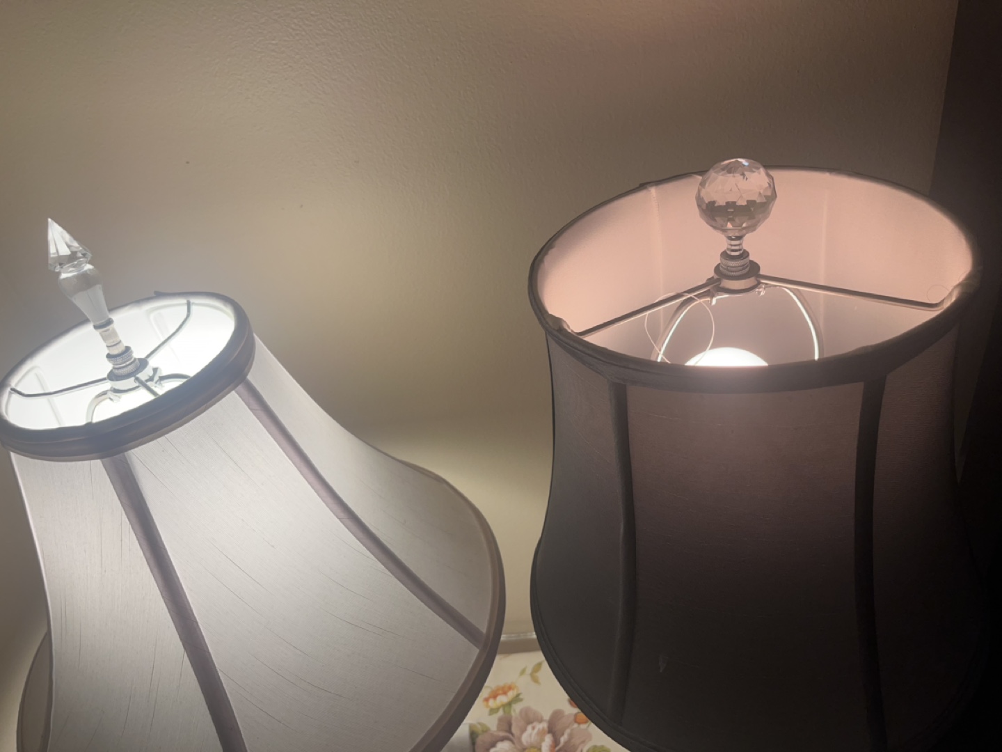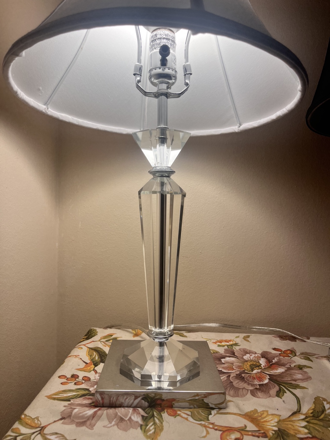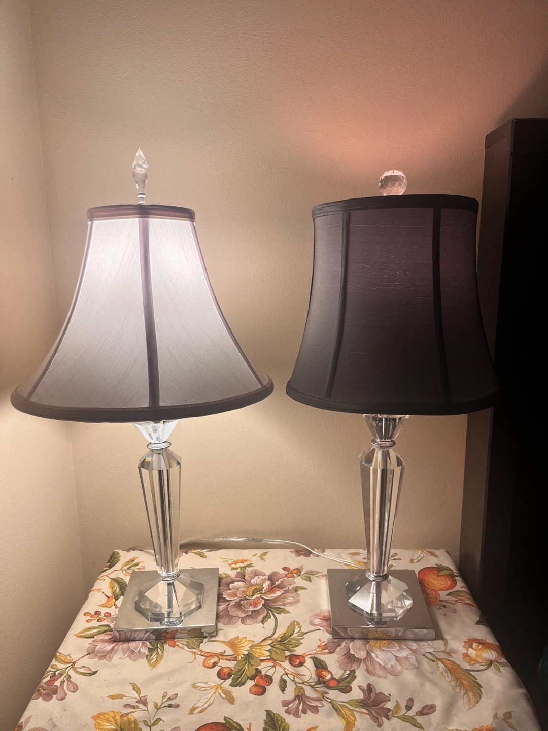 Set of 2 crystal side table lamps. Stands are identical, shades are different. Bulbs not included with purchase, only used here for show.