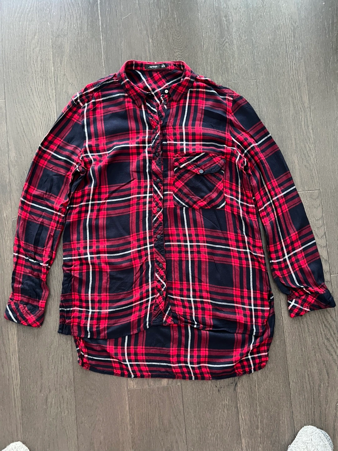 Women's long-sleeve button-up shirt. Red and black plaid pattern. Features a chest pocket. Relaxed fit. Slightly longer in the back.
