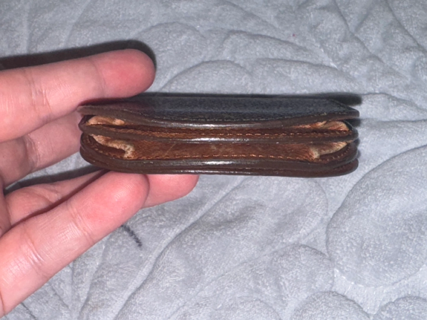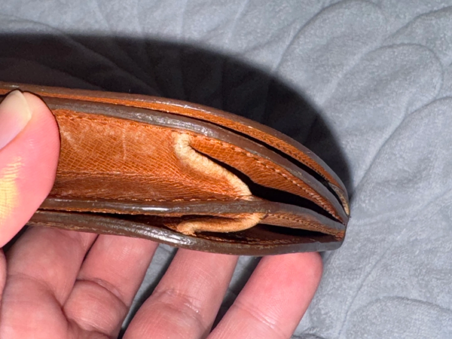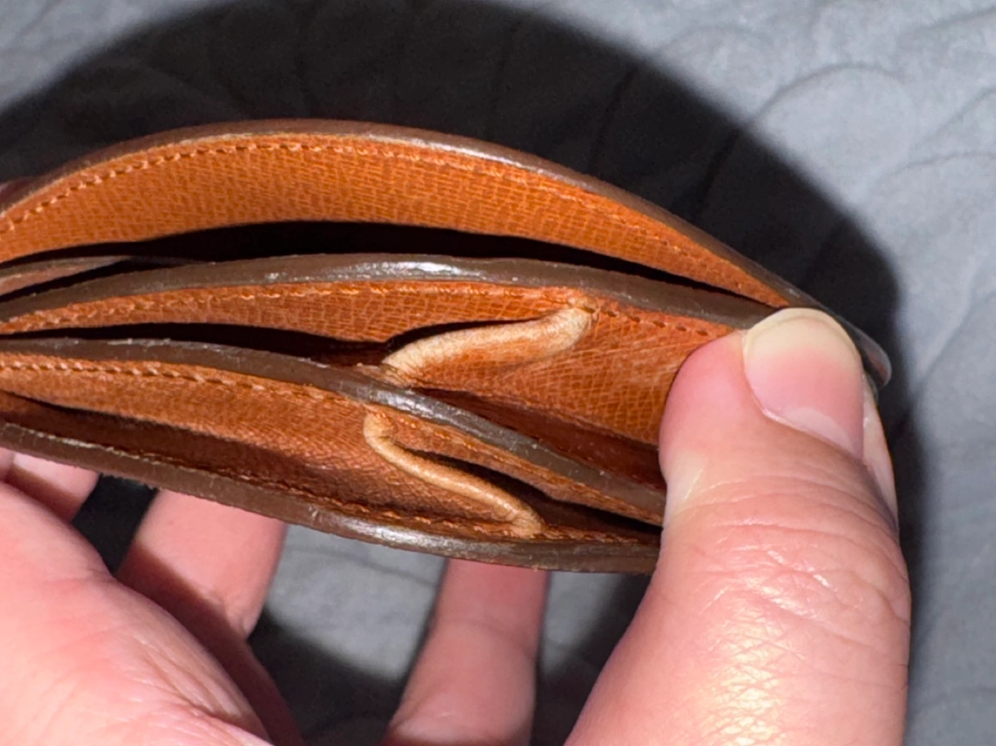 Some scratches and peeling on the leather part also on the inside but no sticky part can use as is,