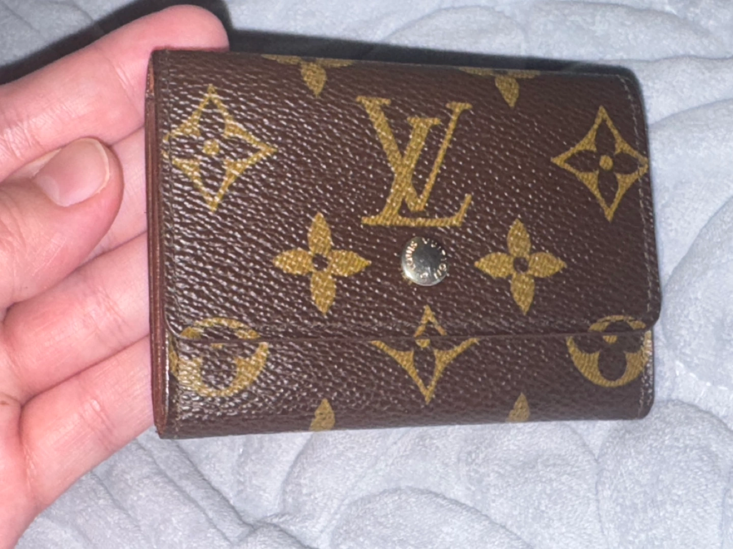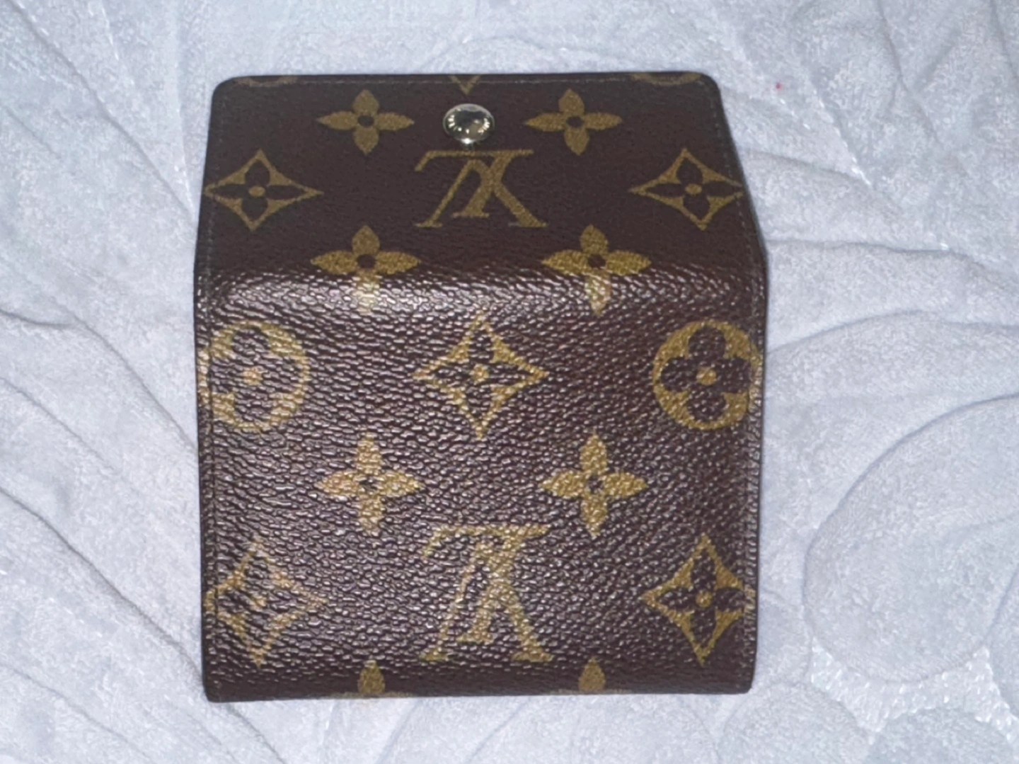 Brown monogram canvas. Small and compact. Snap closure. Made in France. Classic design.