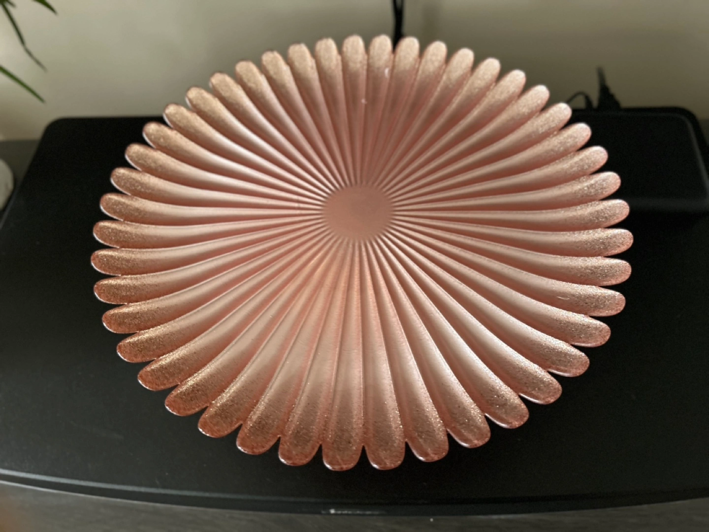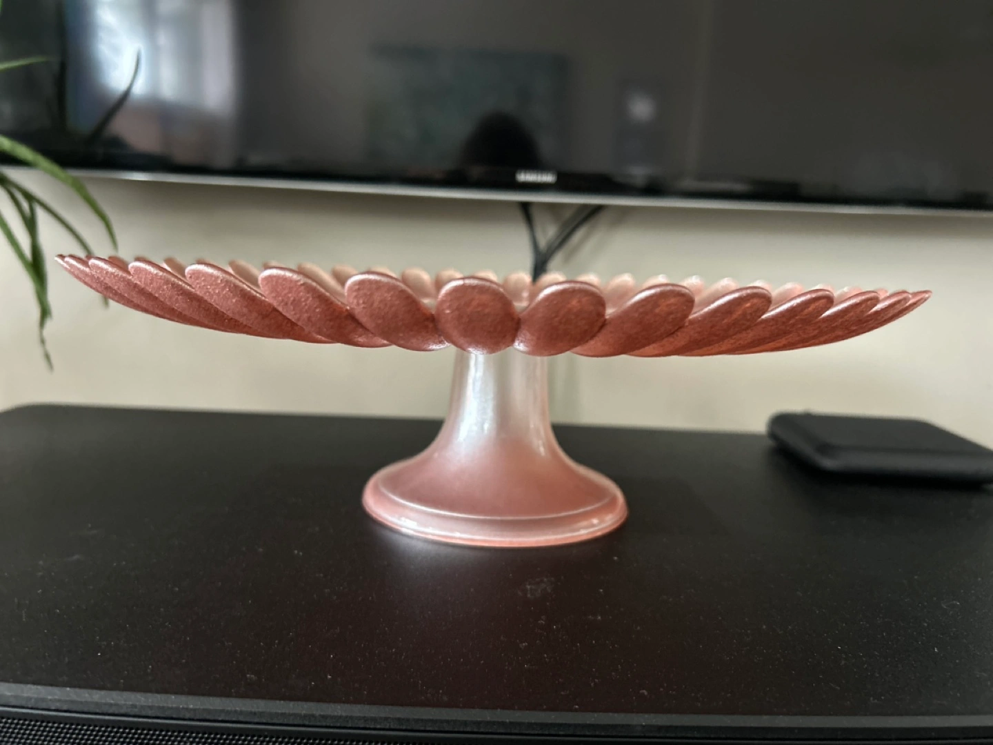 Elegant rose gold cake stand. Beautiful design, perfect for parties or special occasions. Features a wide, decorative top and a sturdy pedestal base.