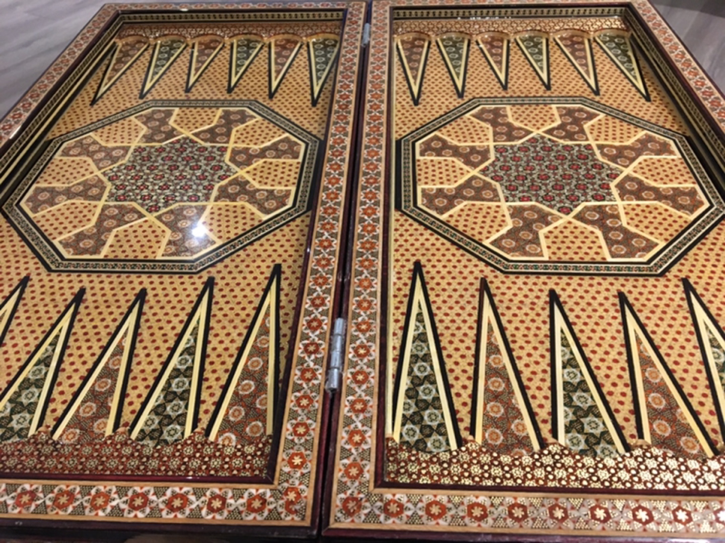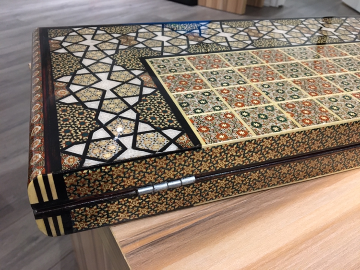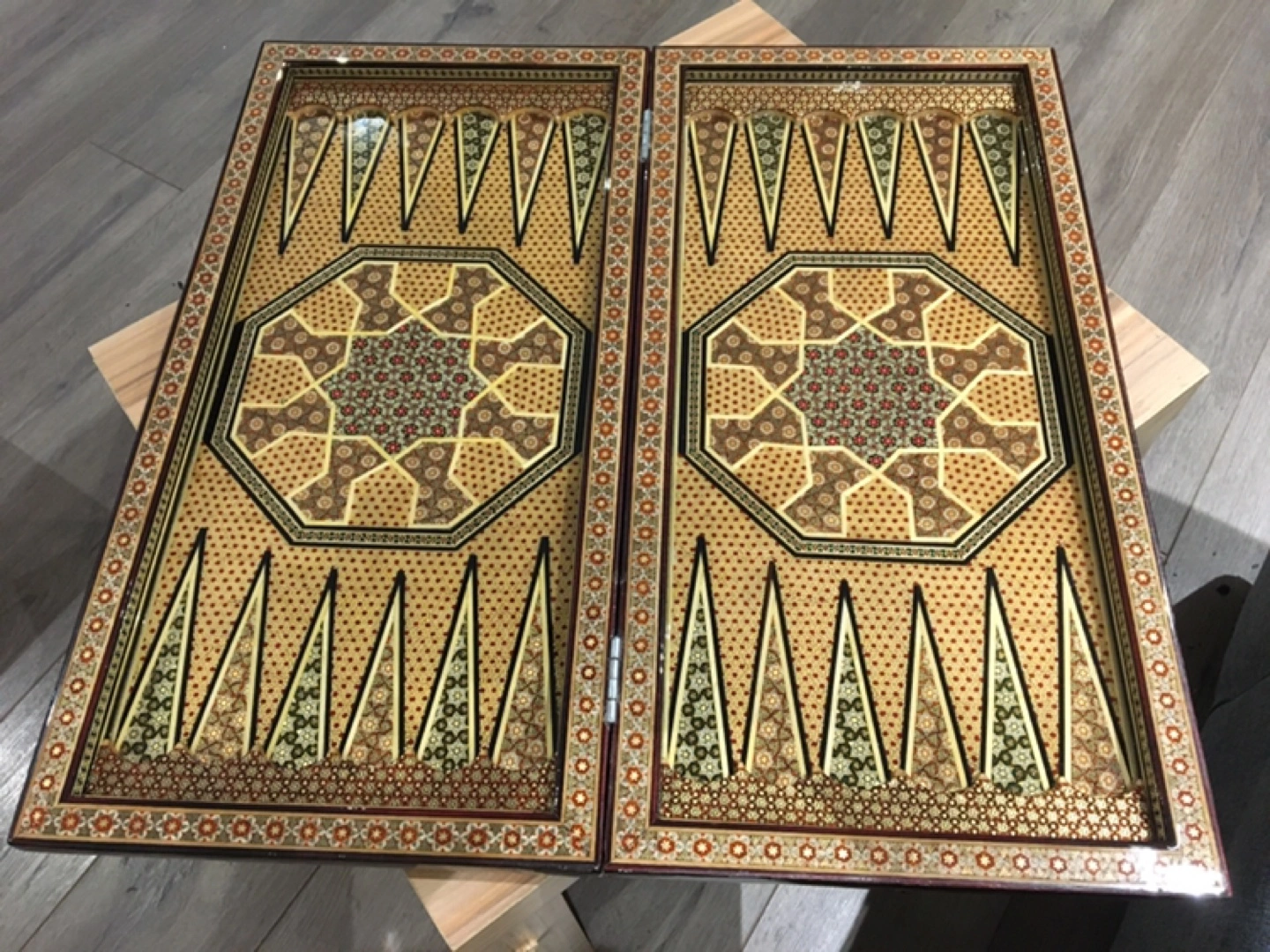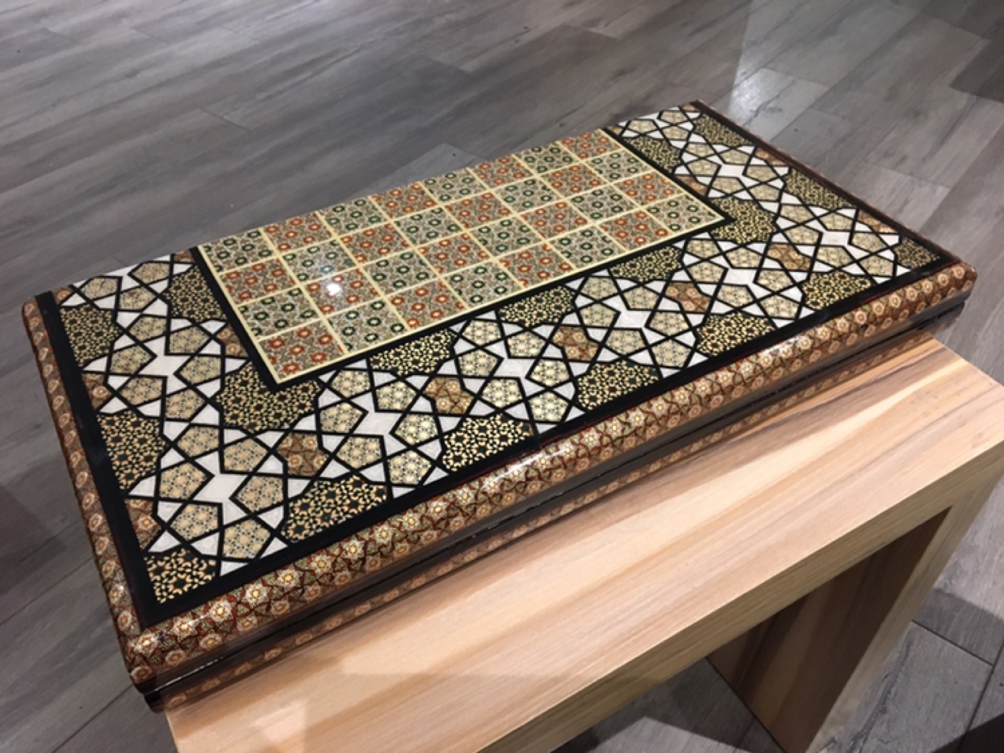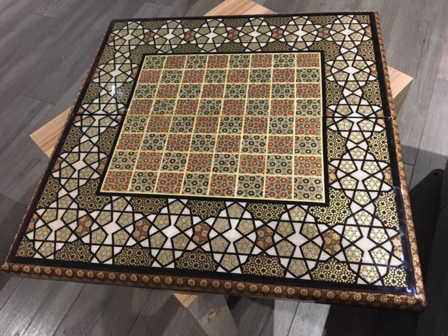Stunning backgammon and chess game board. Features intricate mosaic inlay work. Beautiful gold, beige, and brown tones. Unique and elegant piece. Perfect for game nights or display.