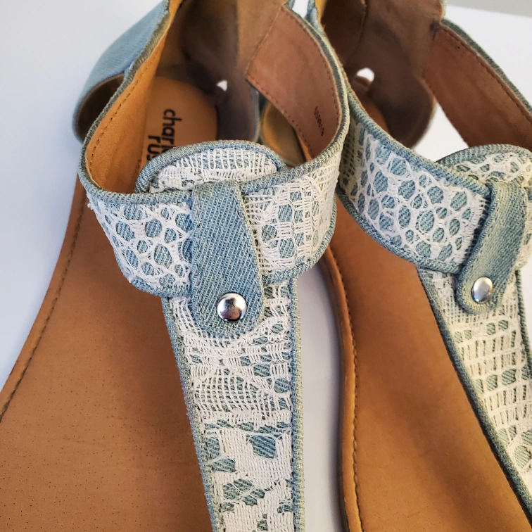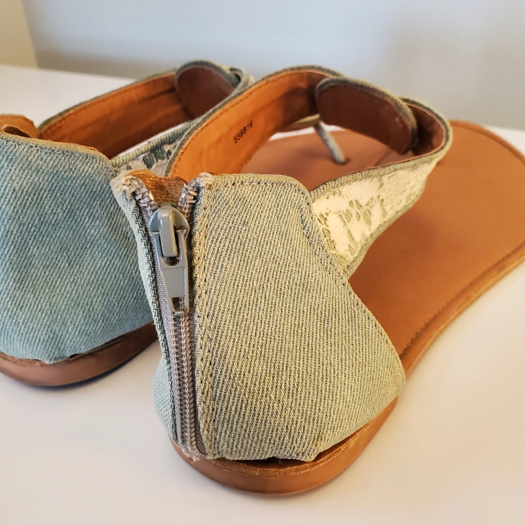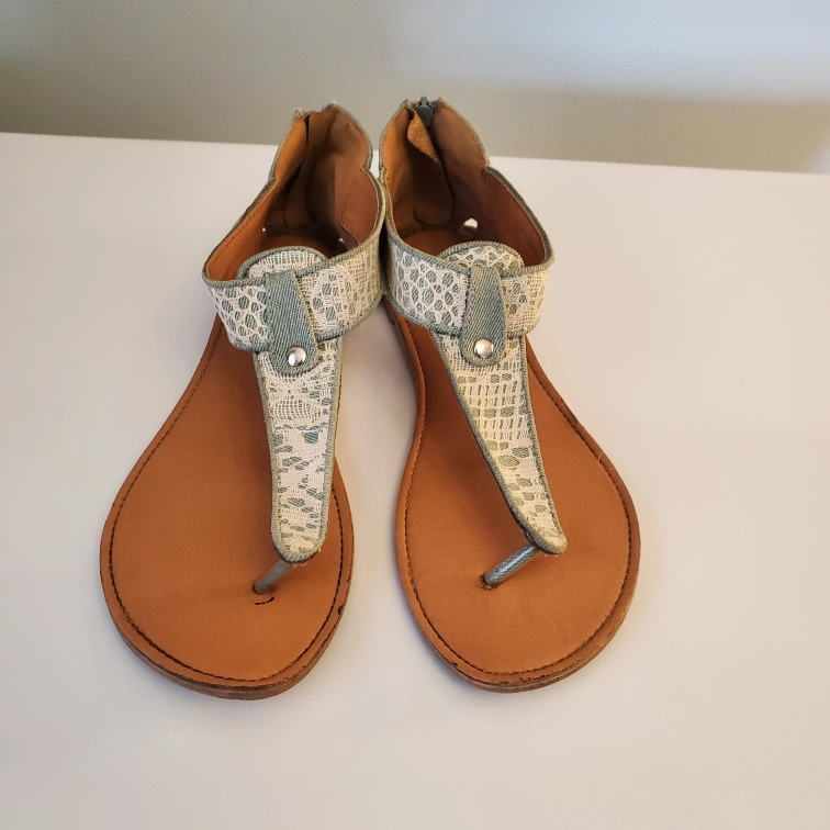 Women's sandals. Light blue denim and white lace. Back zipper closure. Tan leather soles. Size 8. Most of the wear is on the bottom. Shoes have been cleaned.