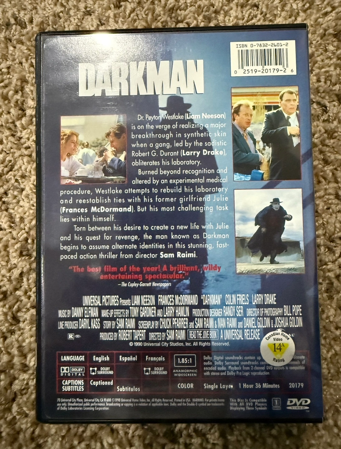 Universal Pictures presents Liam Neeson and Frances McDormand in Darkman. Directed by Sam Raimi, the widescreen version of this region 1 DVD features Dolby Digital and Dolby Surround Sound, English, French and Spanish language tracks, and captioned subtitles.