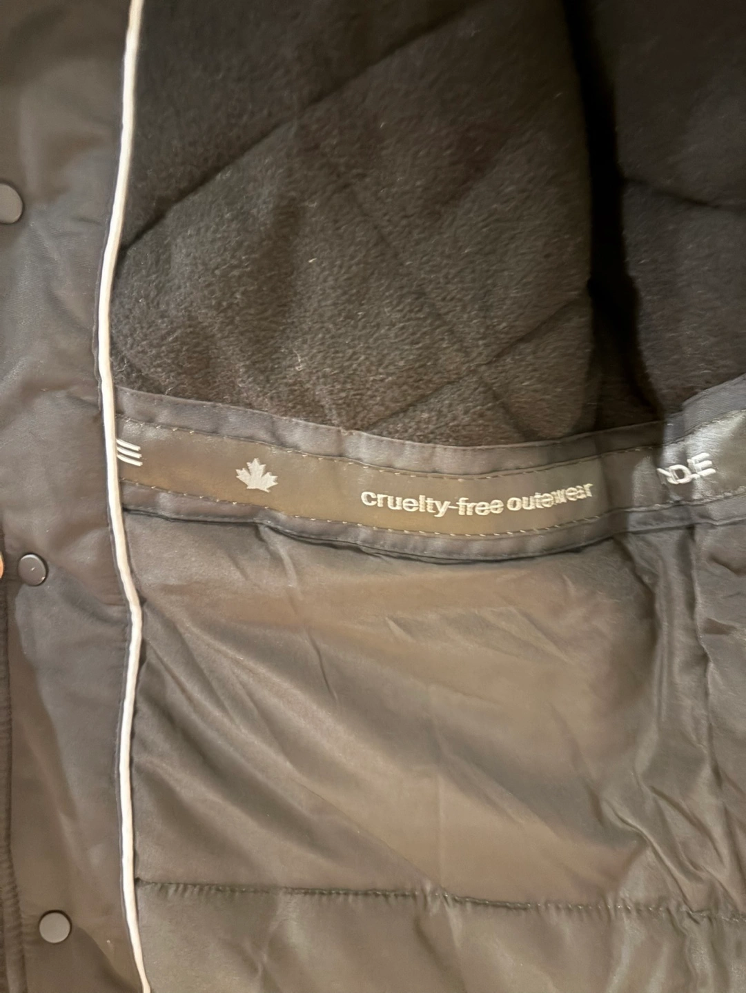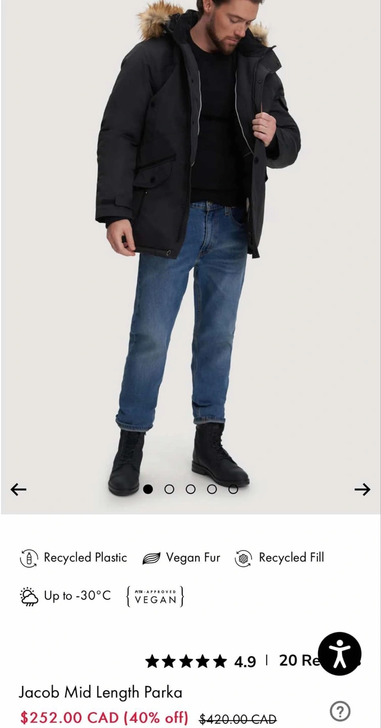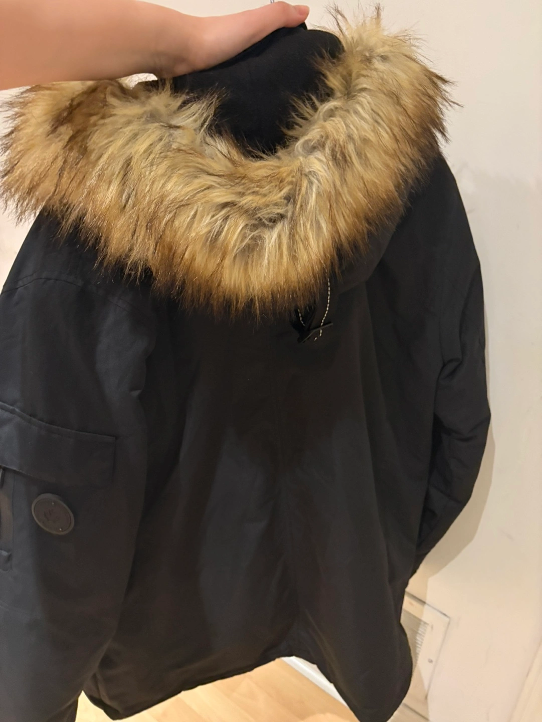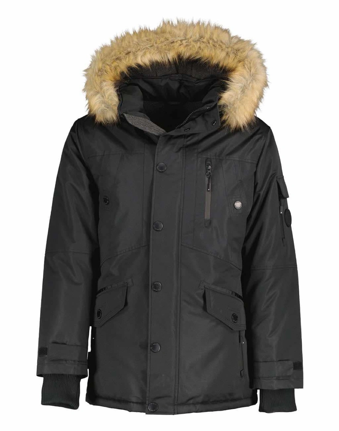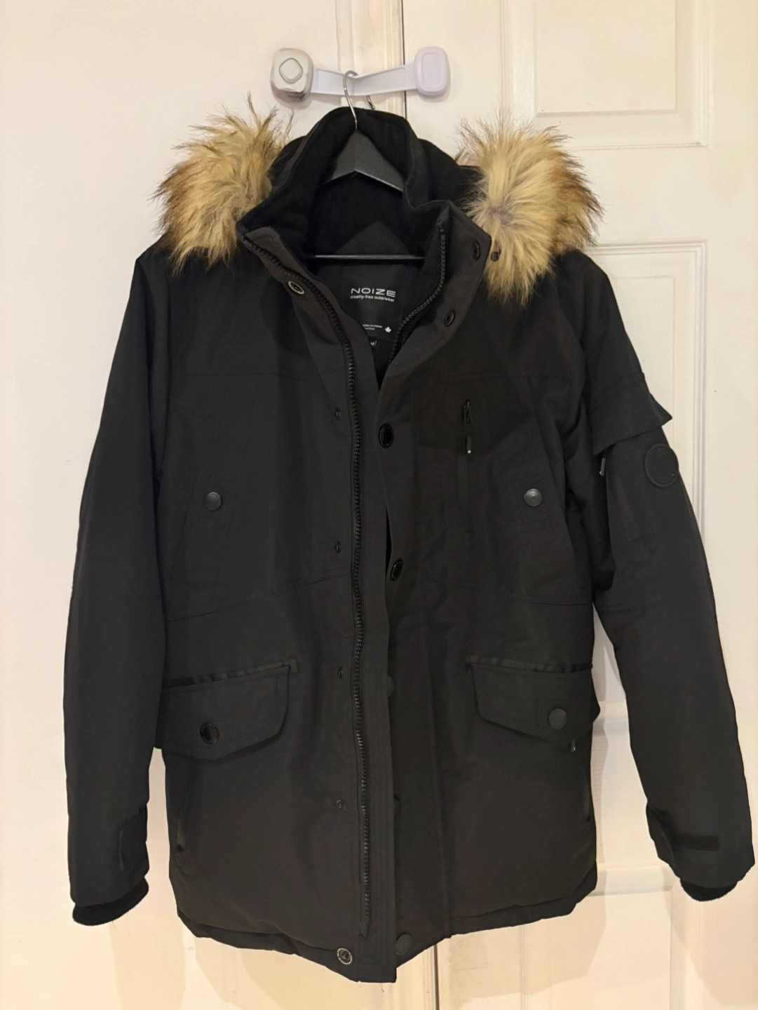 Noize Men's black winter parka. Size Medium. Features a faux fur-lined hood, multiple pockets, and button and zipper closures. Cruelty-free outerwear.