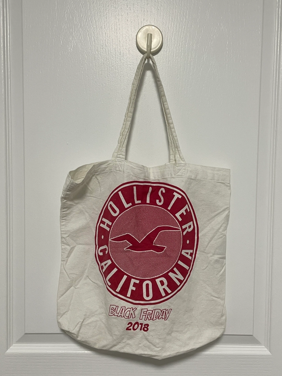 DECLUTTERING SALE 🏡 CASH ONLY 💵 Pickup @ North York Metro 🛍️ 📍Pickup address: 20 Church Ave, Toronto, M2N 0B7 ✅ Large white cotton tote bag ✅ Features a red Hollister California logo and Black Friday 2018 text 💰 NOW $1 CAD