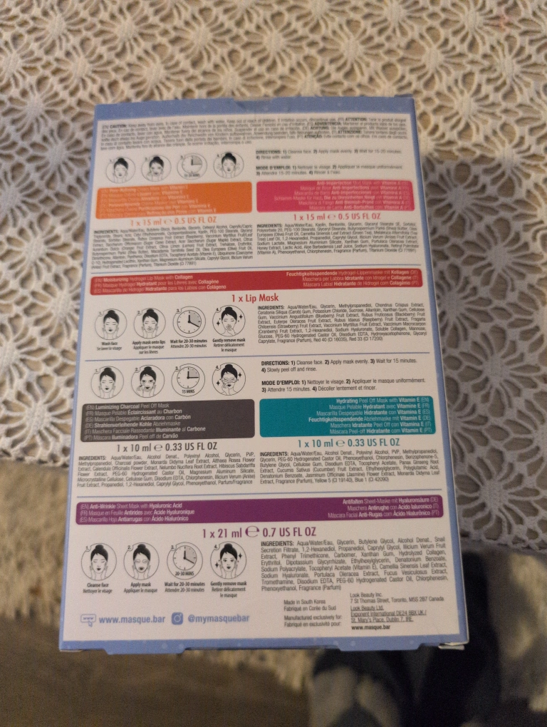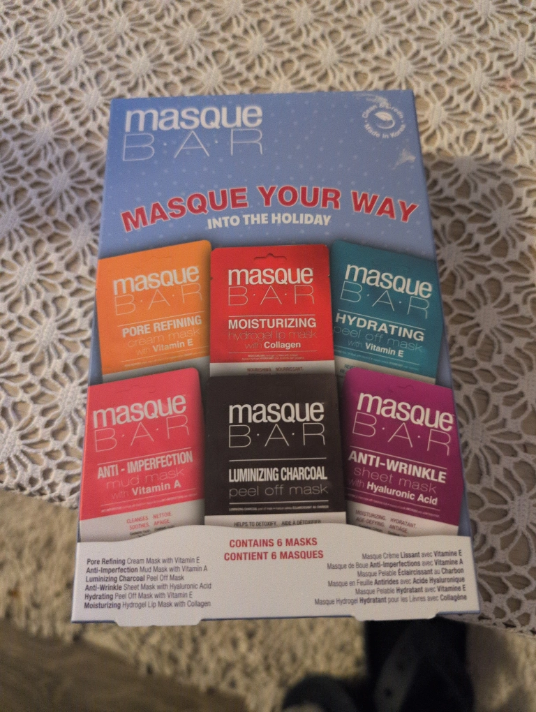 Six individual sheet masks. Variety pack includes pore refining, moisturizing, hydrating, anti-imperfection, luminizing charcoal peel-off, and anti-wrinkle. New, unopened box.
