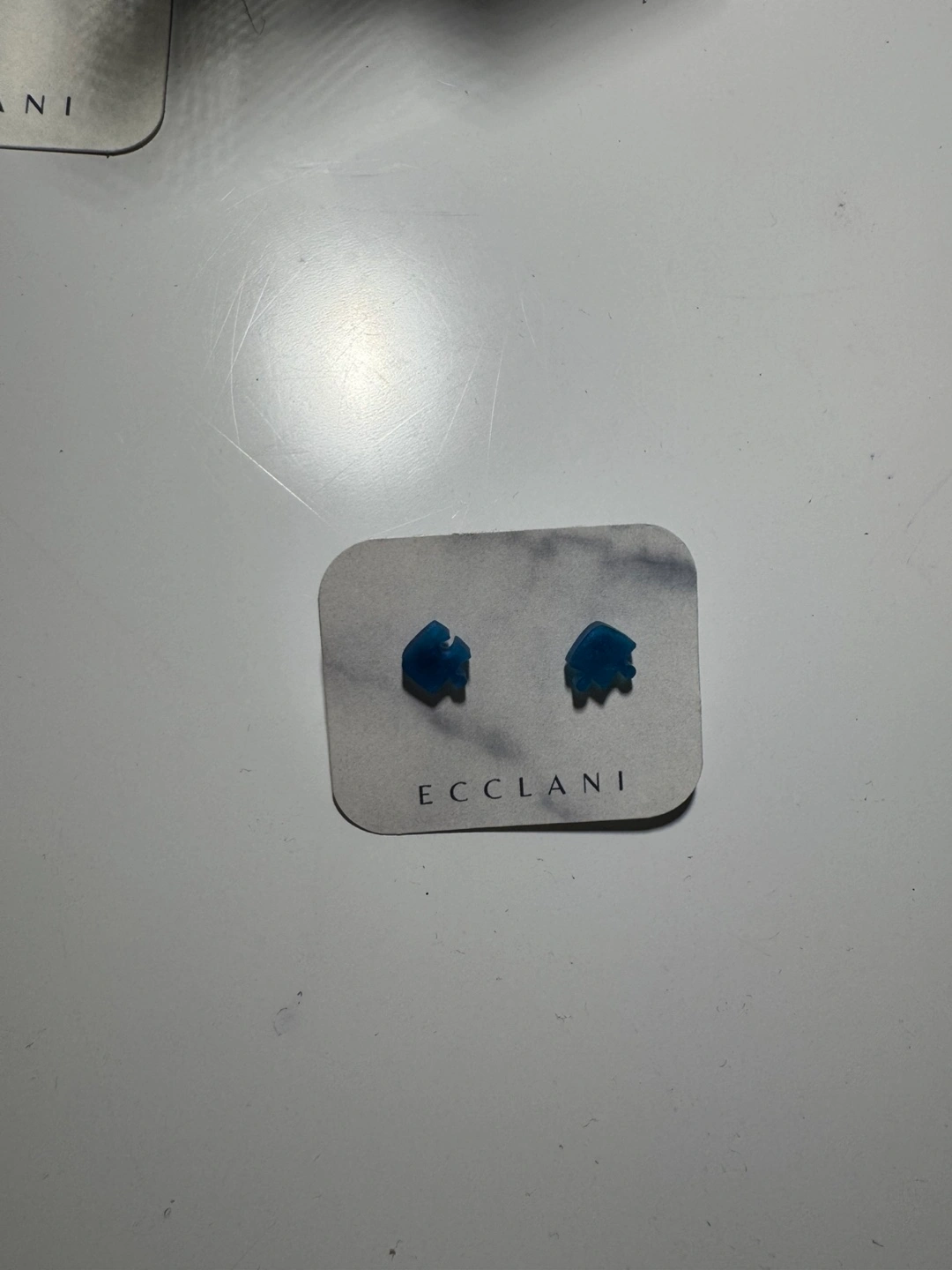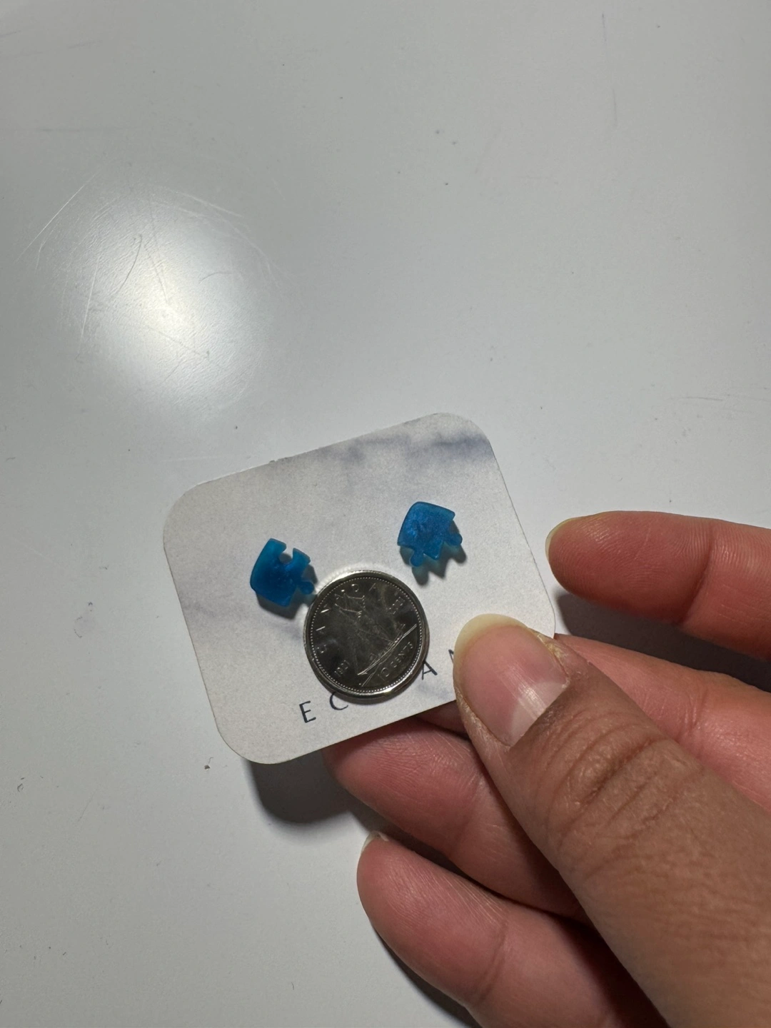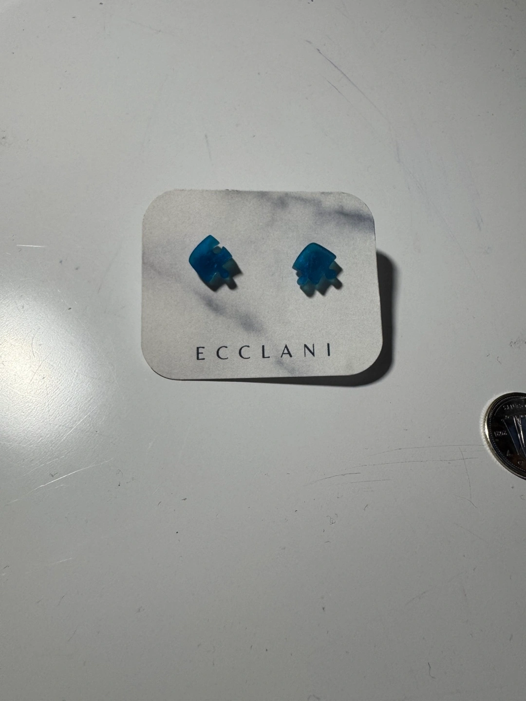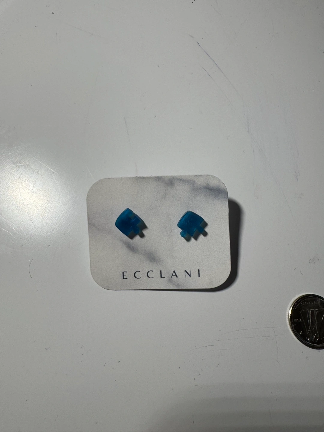 Pair of blue resin stud earrings. Unique design. Small and subtle. Perfect for everyday wear. Coin for scale