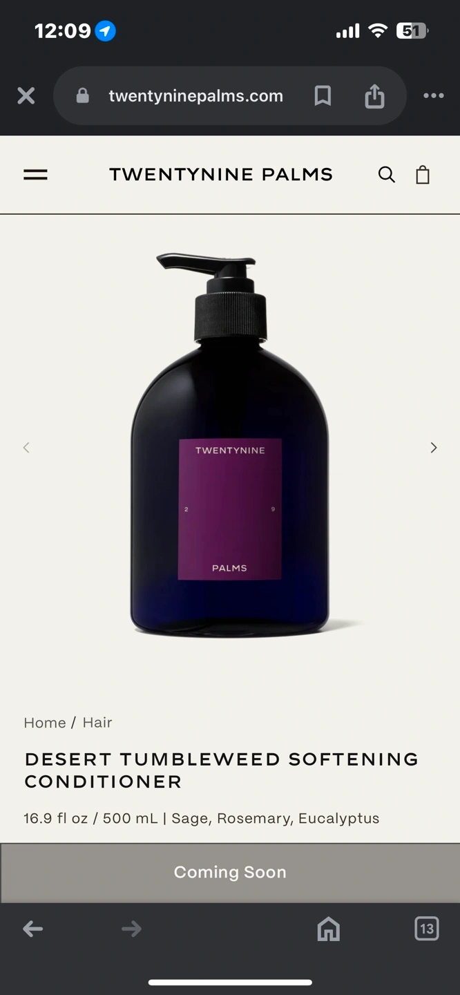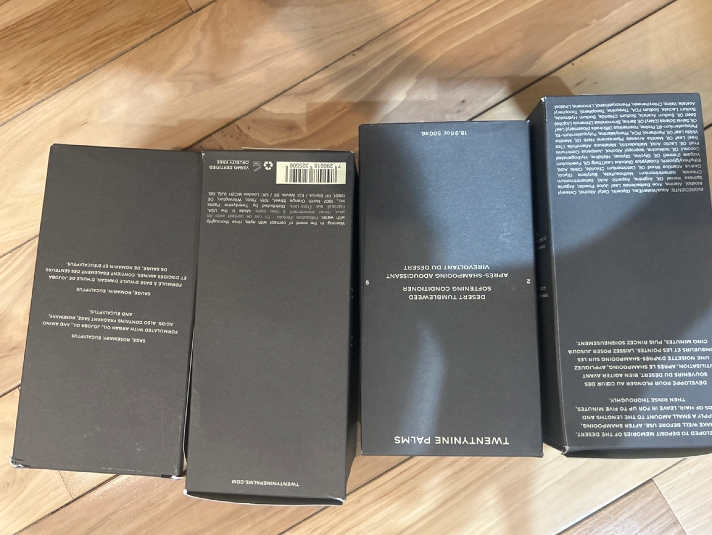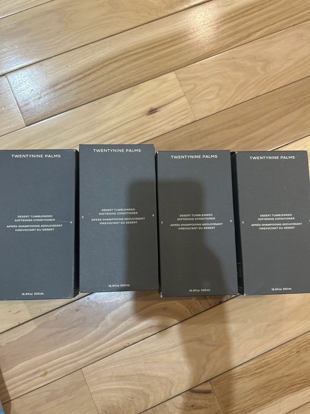 Four unopened boxes of Twenty Nine Palms Desert Tumbleweed Softening Conditioner. 16.9 fl oz / 500 mL. Sage, Rosemary, Eucalyptus scent.