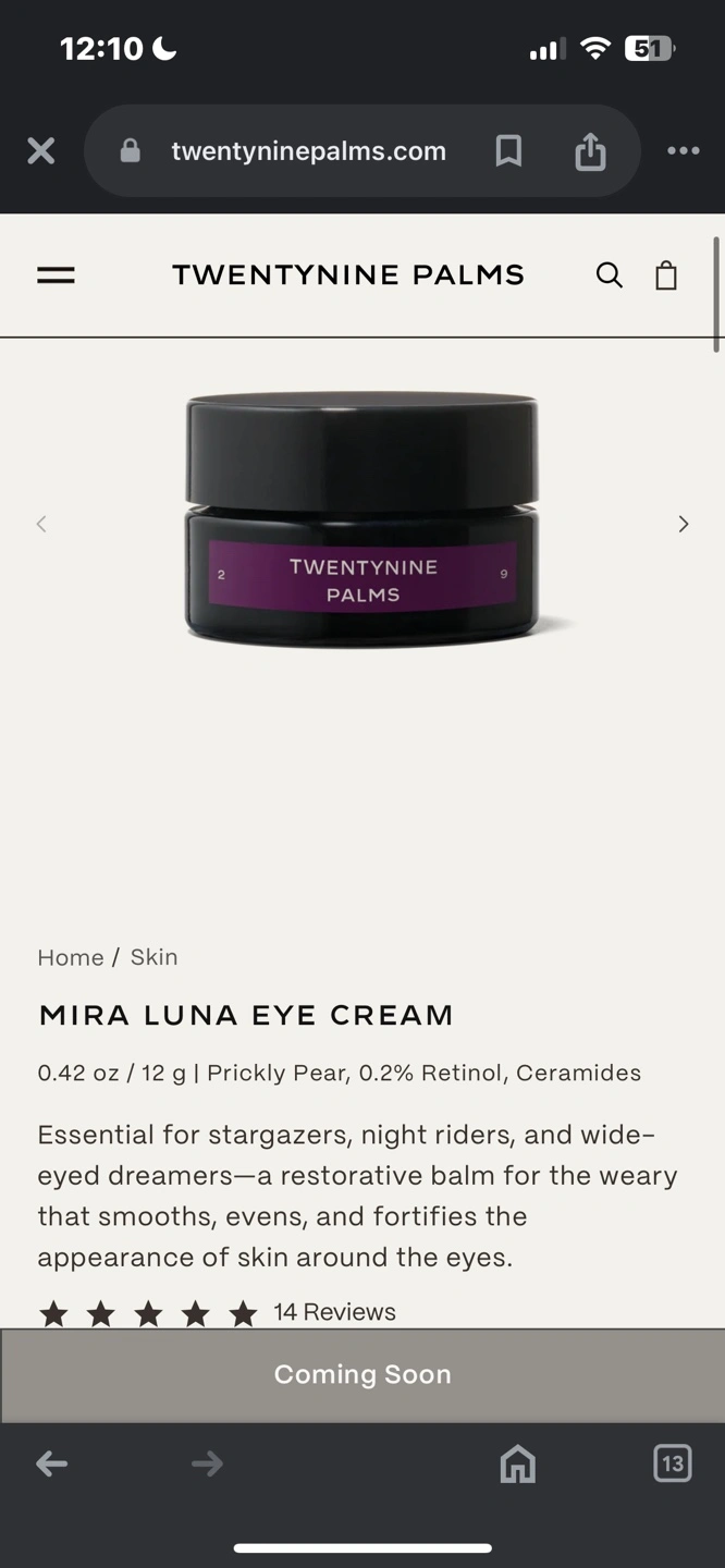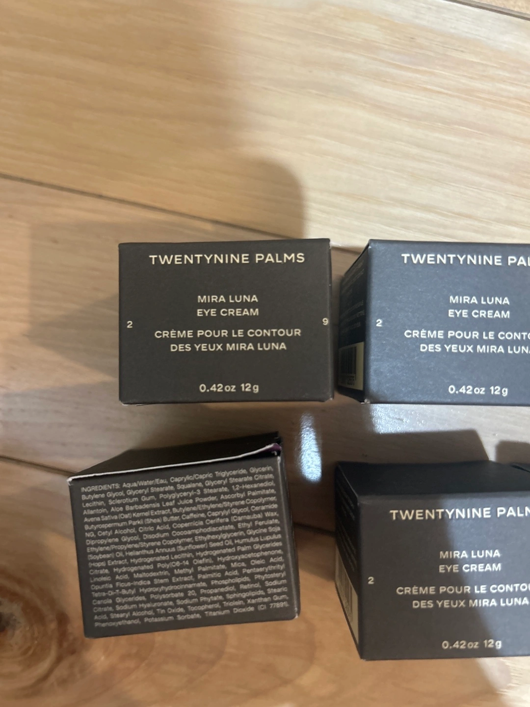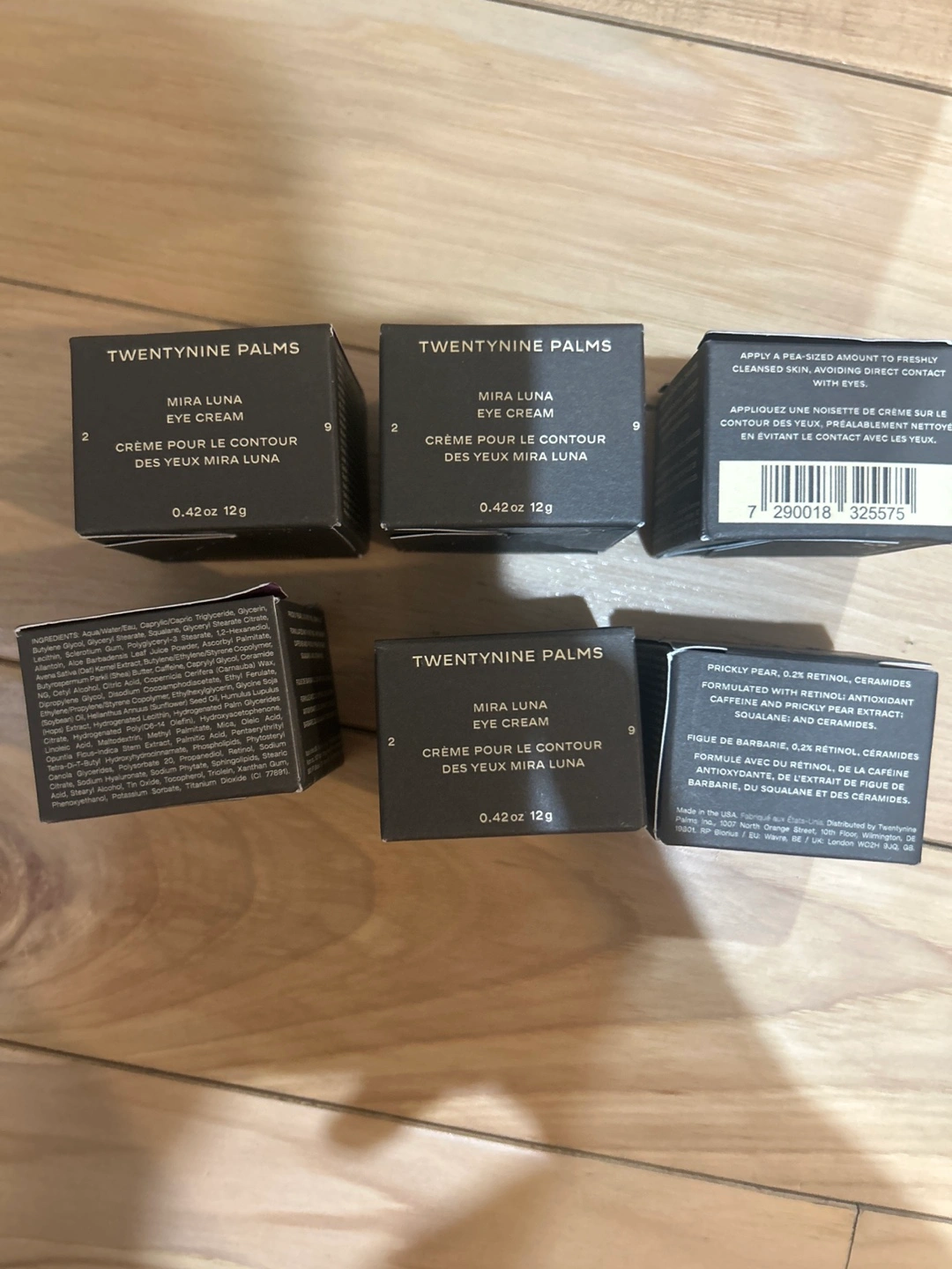 Five tubes of TWENTY NINE PALMS Mira Luna Eye Cream. Prickly pear, 0.2% retinol, ceramides. Essential for stargazers, night riders, and wide-eyed dreamers. A restorative balm for the weary that smooths and fortifies the appearance of skin around the eyes.