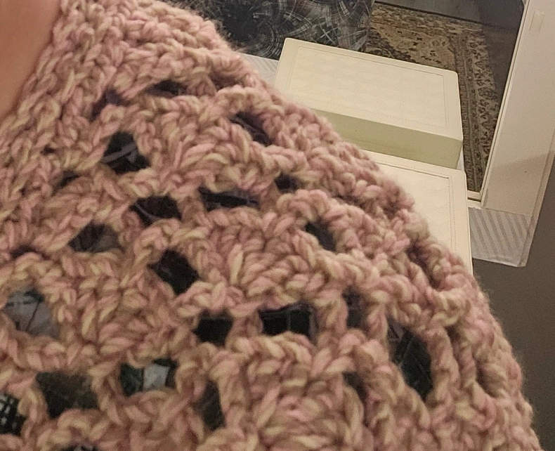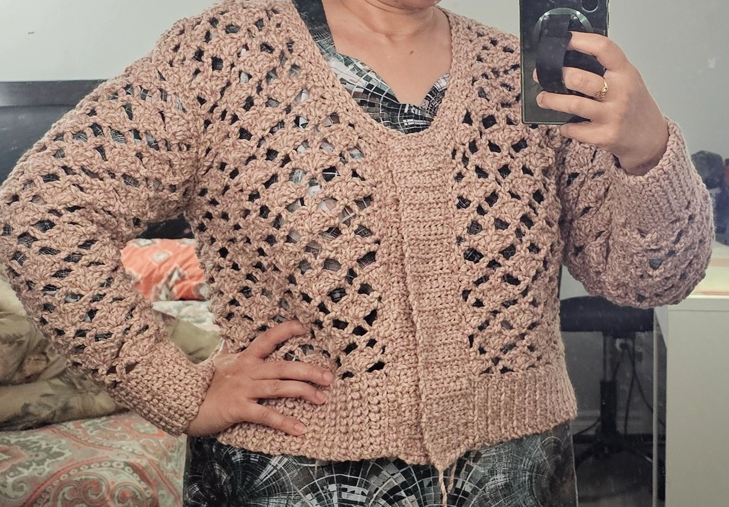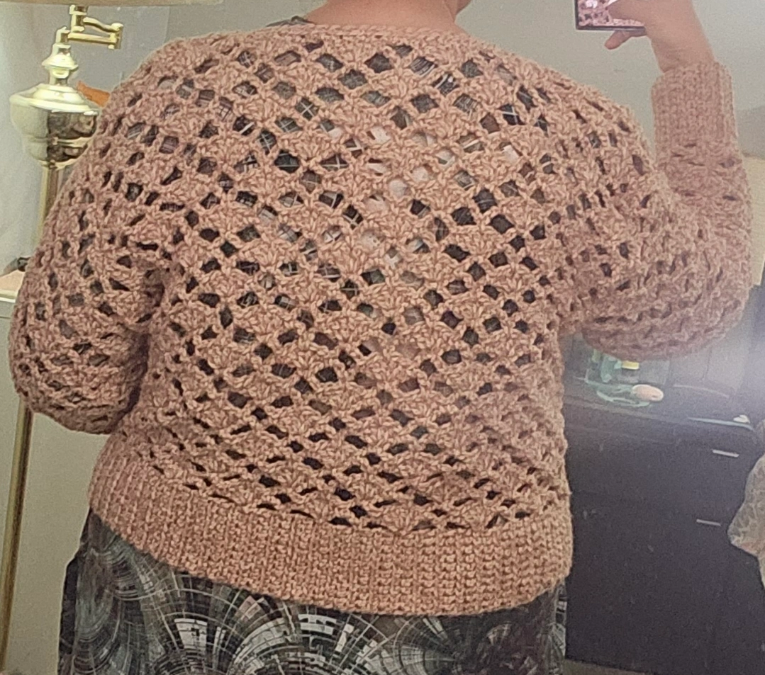 Dusty rose coloured crocheted cardigan. Open-weave pattern. Long sleeves. Relaxed fit. Lightweight and comfortable.