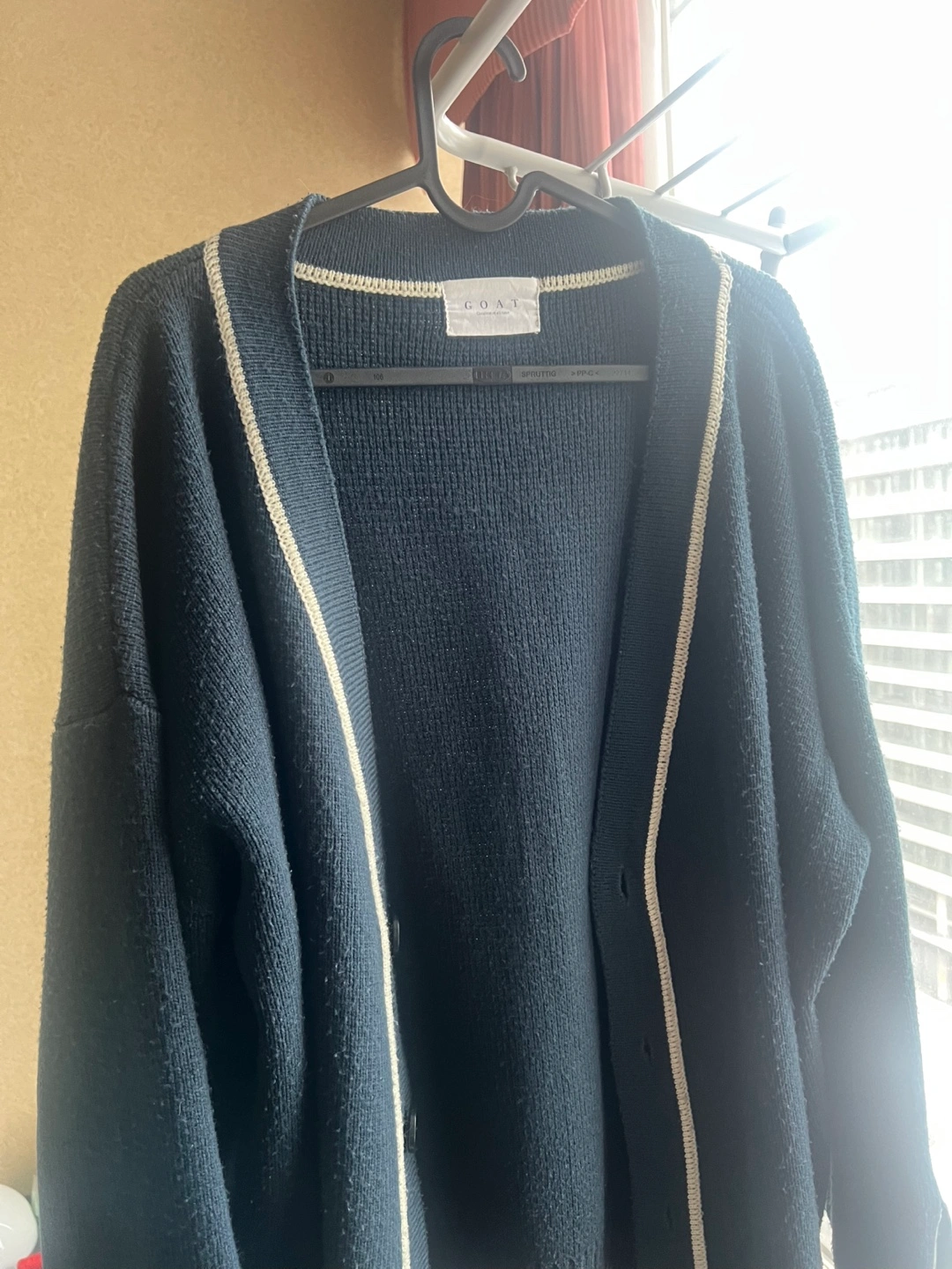 Dark teal cardigan. Features cream coloured trim. Button closure. Relaxed fit. Pre-owned.