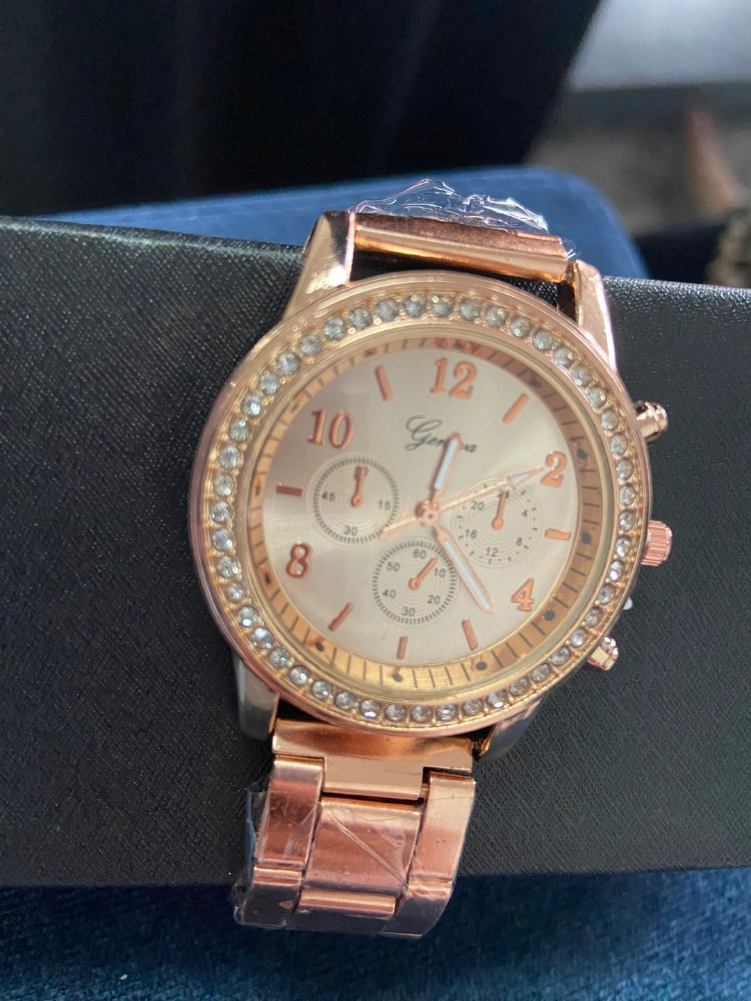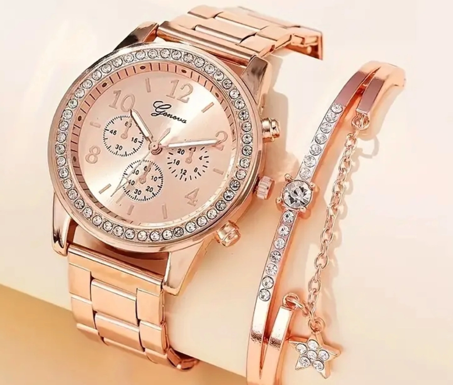 Gorgeous rose gold watch and bracelet set. Watch features crystal accents. Bracelet features a delicate chain and star charm. Perfect for everyday wear.