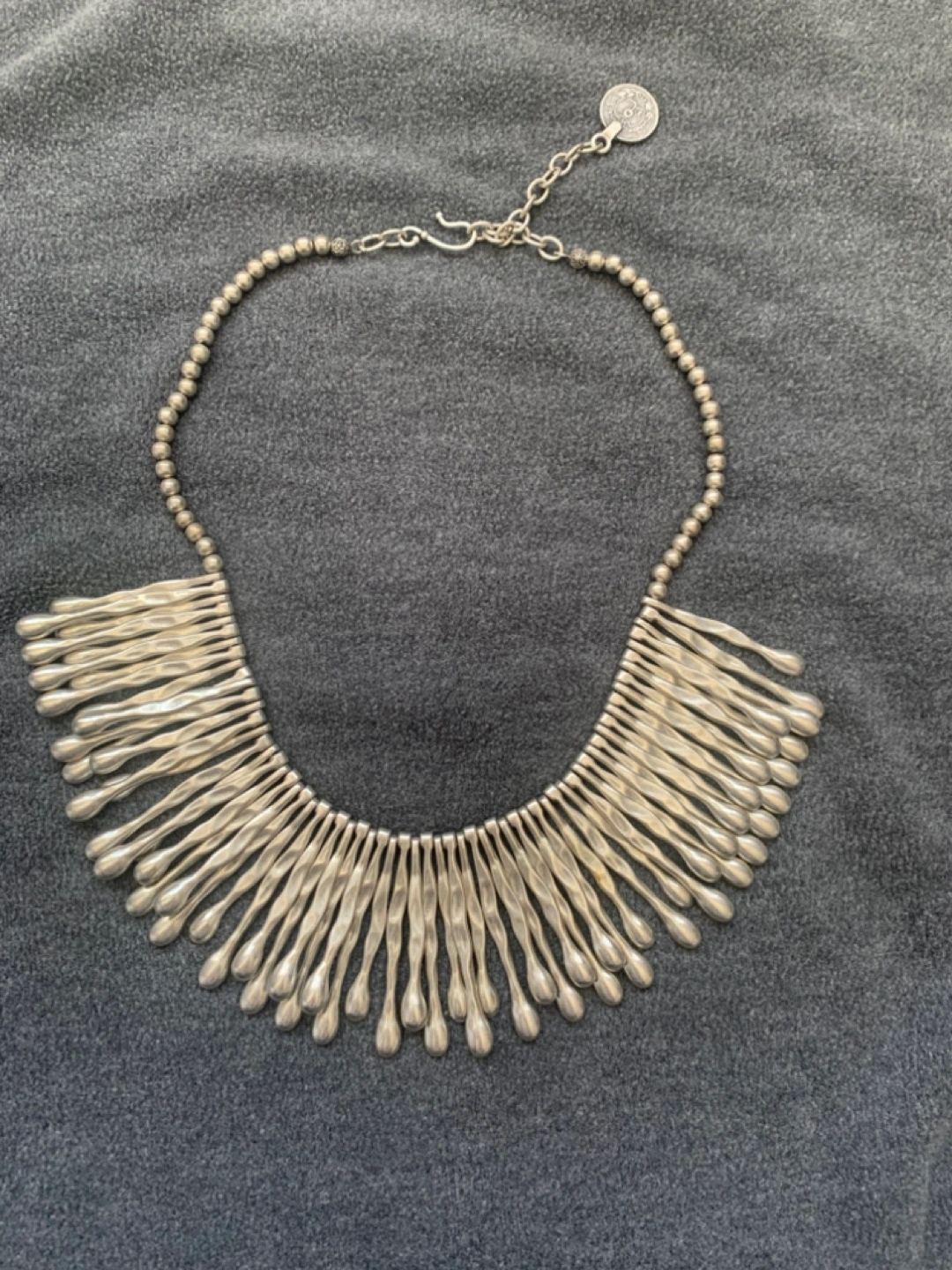 Unique statement necklace. Silver tone metal. Beaded neckline and teardrop accents. Clasp closure. Eye-catching piece for any occasion. Worn once or twice