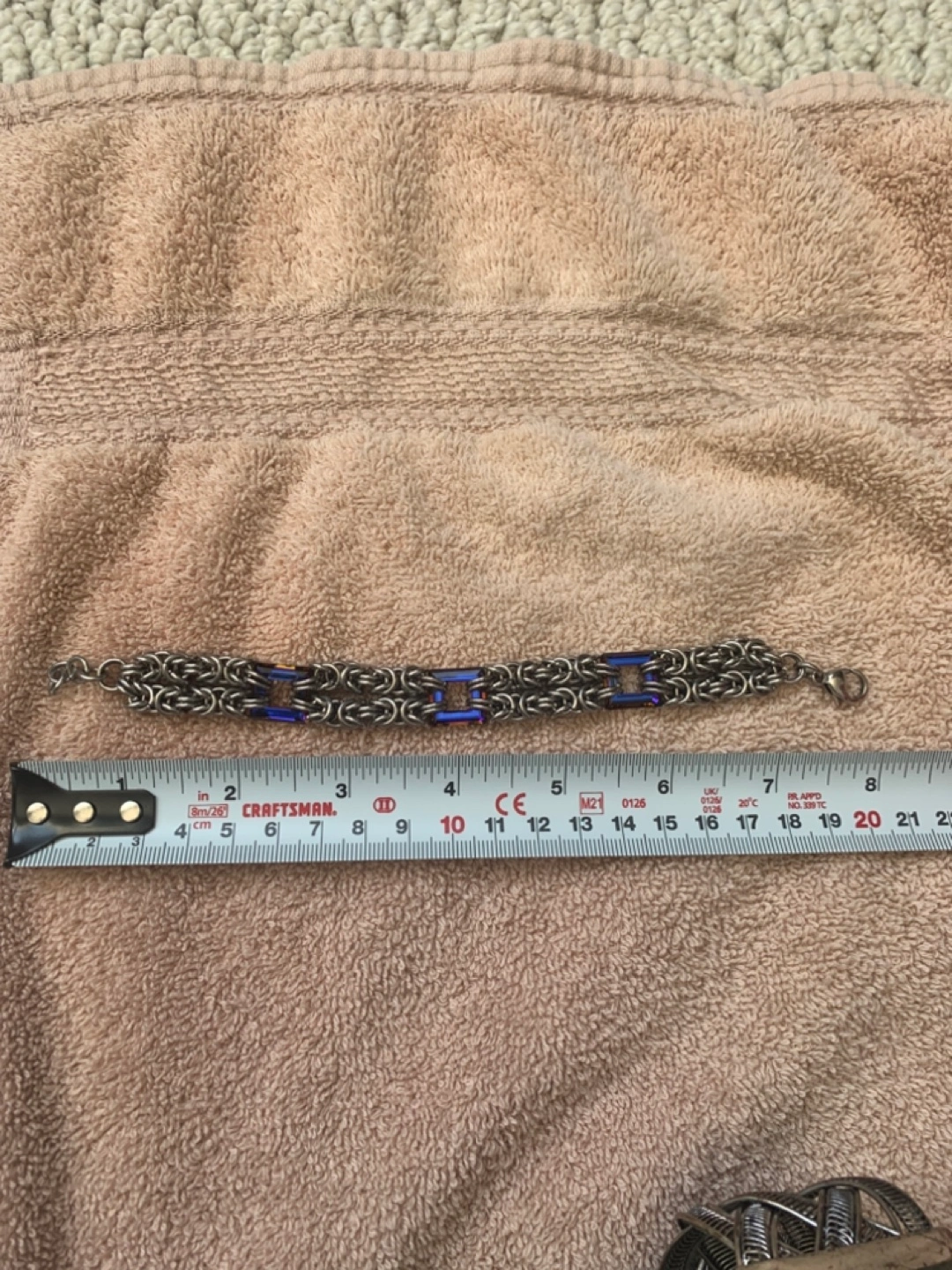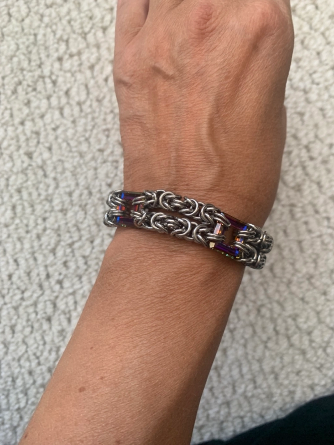 Stunning handmade bracelet. Features a Byzantine chain design with shimmering purple accents. Measures approximately 7 inches long. Secure clasp. Only worn a couple of times.
