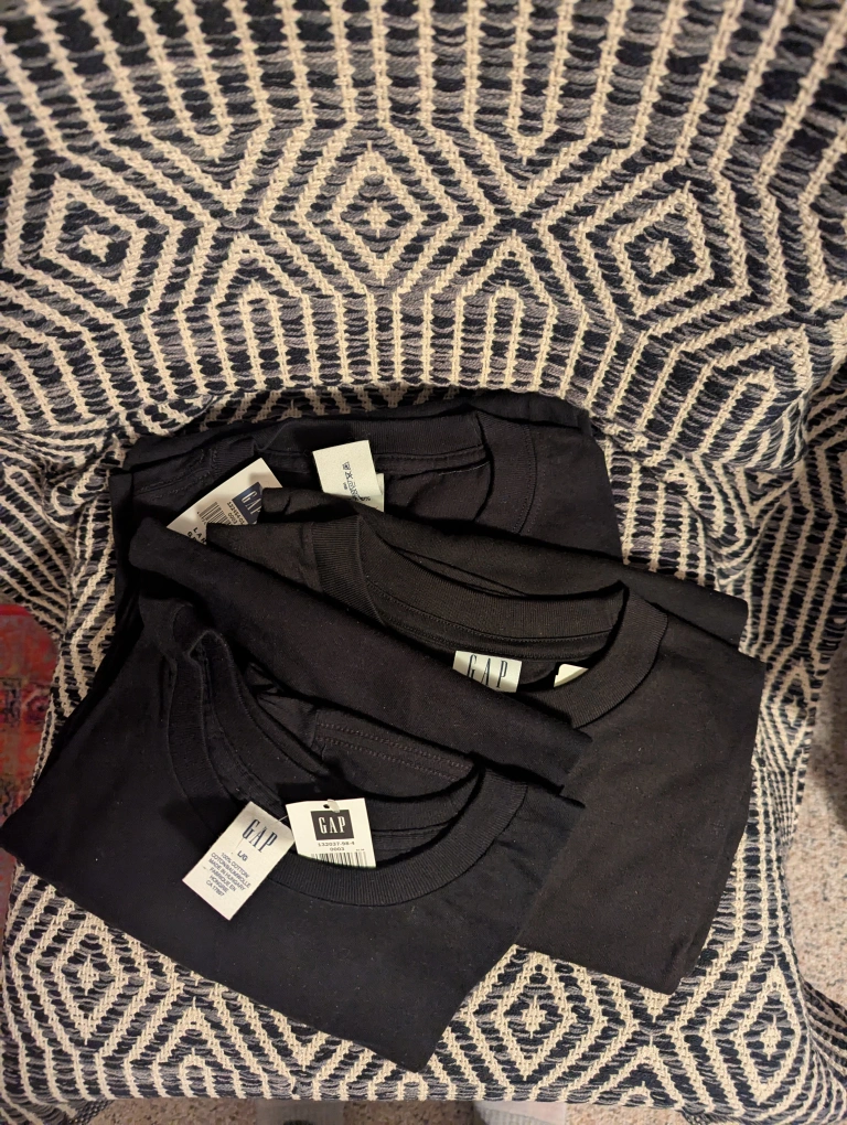 641Three men's short sleeve tee shirts, black, size large from the Gap. Brand new.