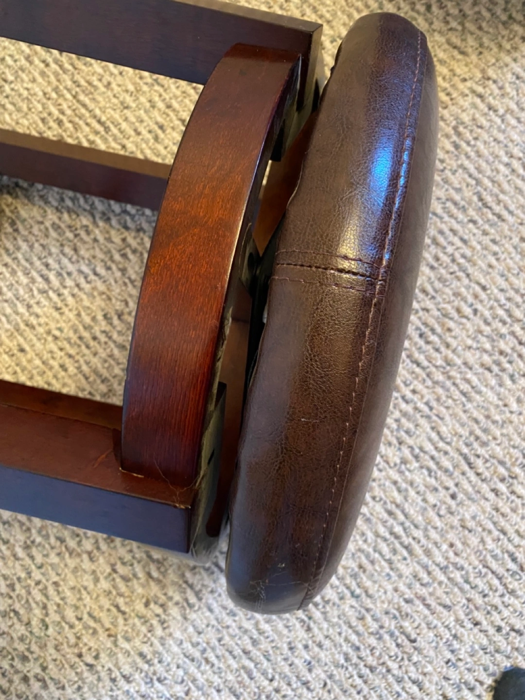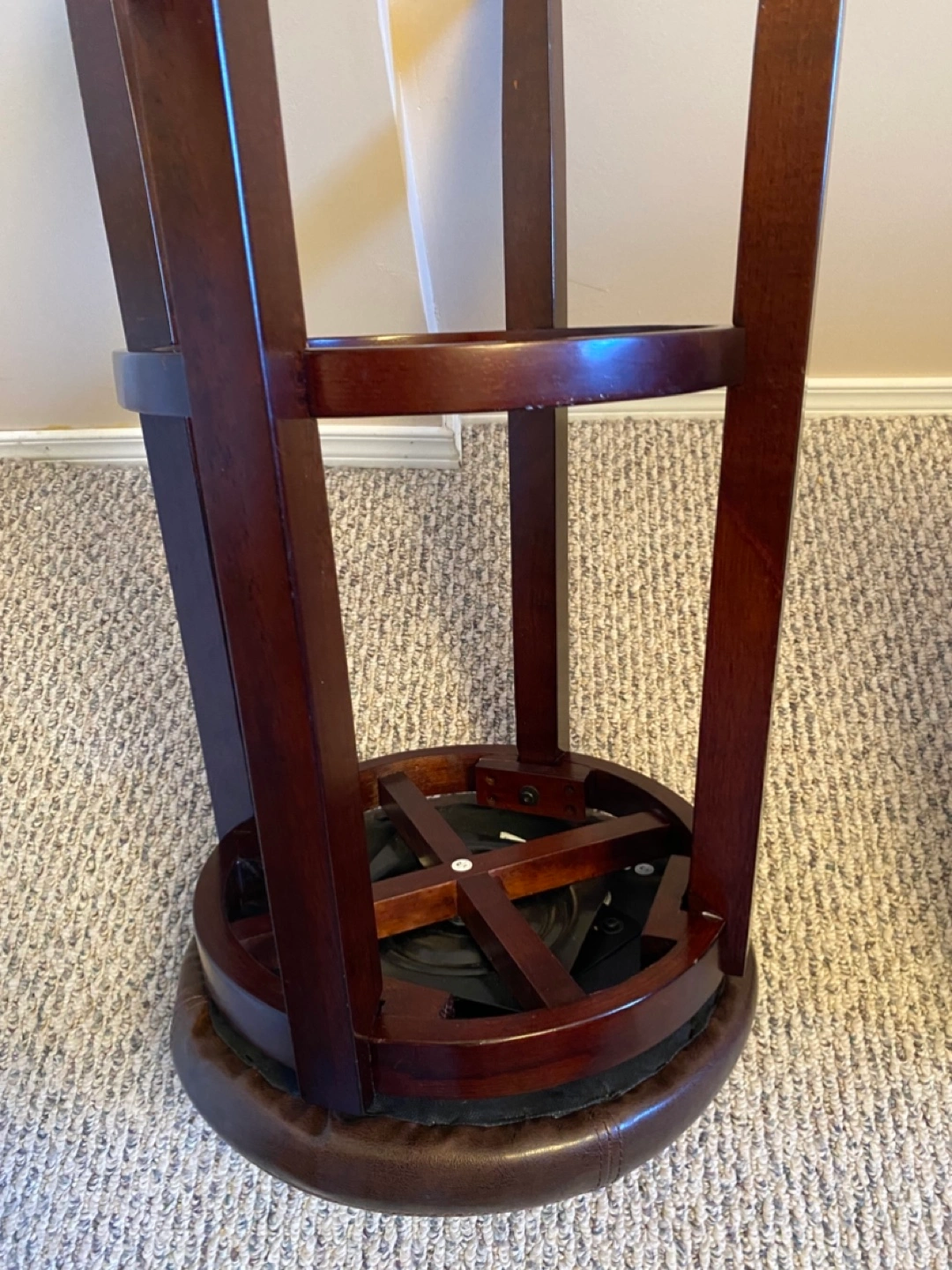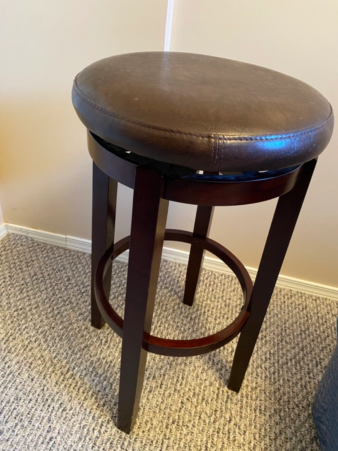 Dark brown bar stool. Swivel seat. Wooden legs. Faux leather seat. Good used condition. Sturdy construction. Price is both