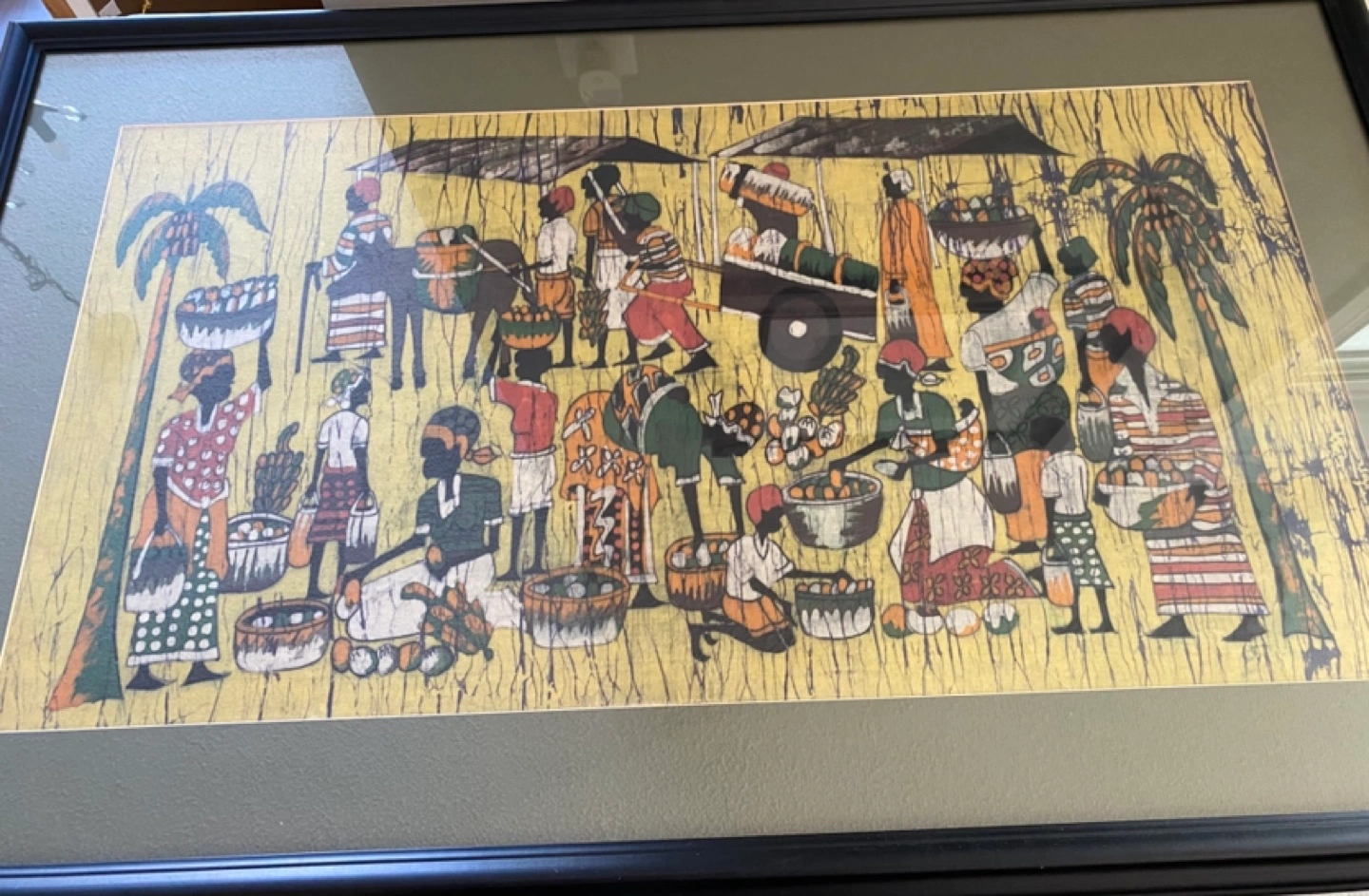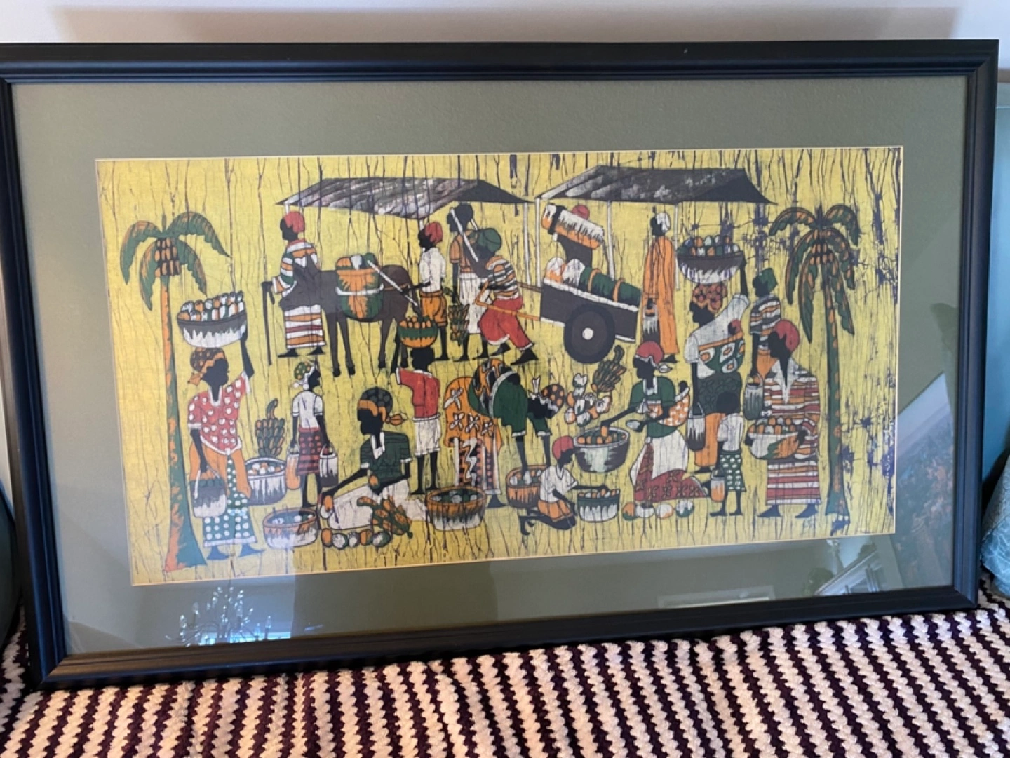 Vibrant batik artwork depicting a bustling African market scene. Framed in a simple black frame. Ready to hang. Beautiful colours and detail.