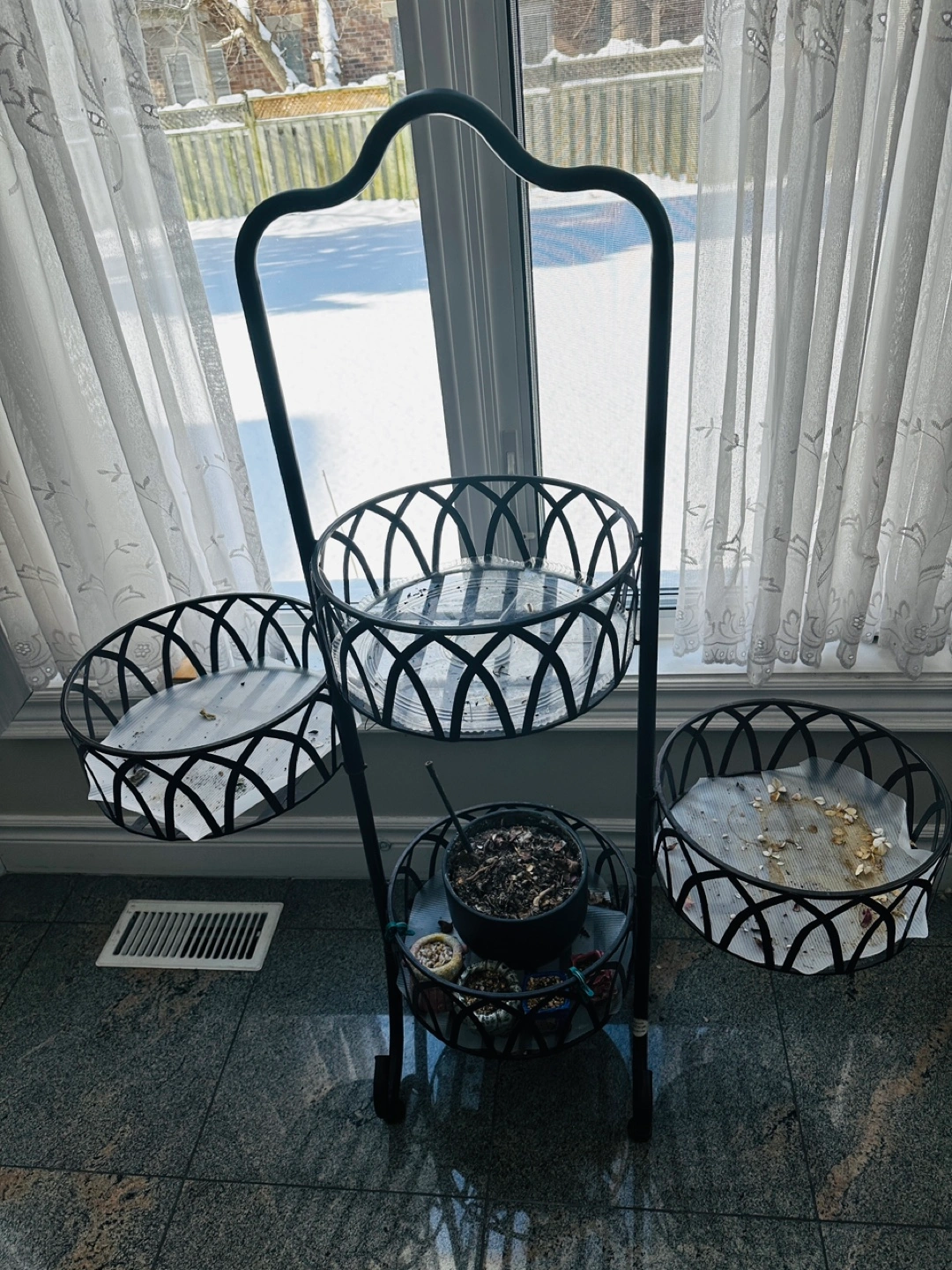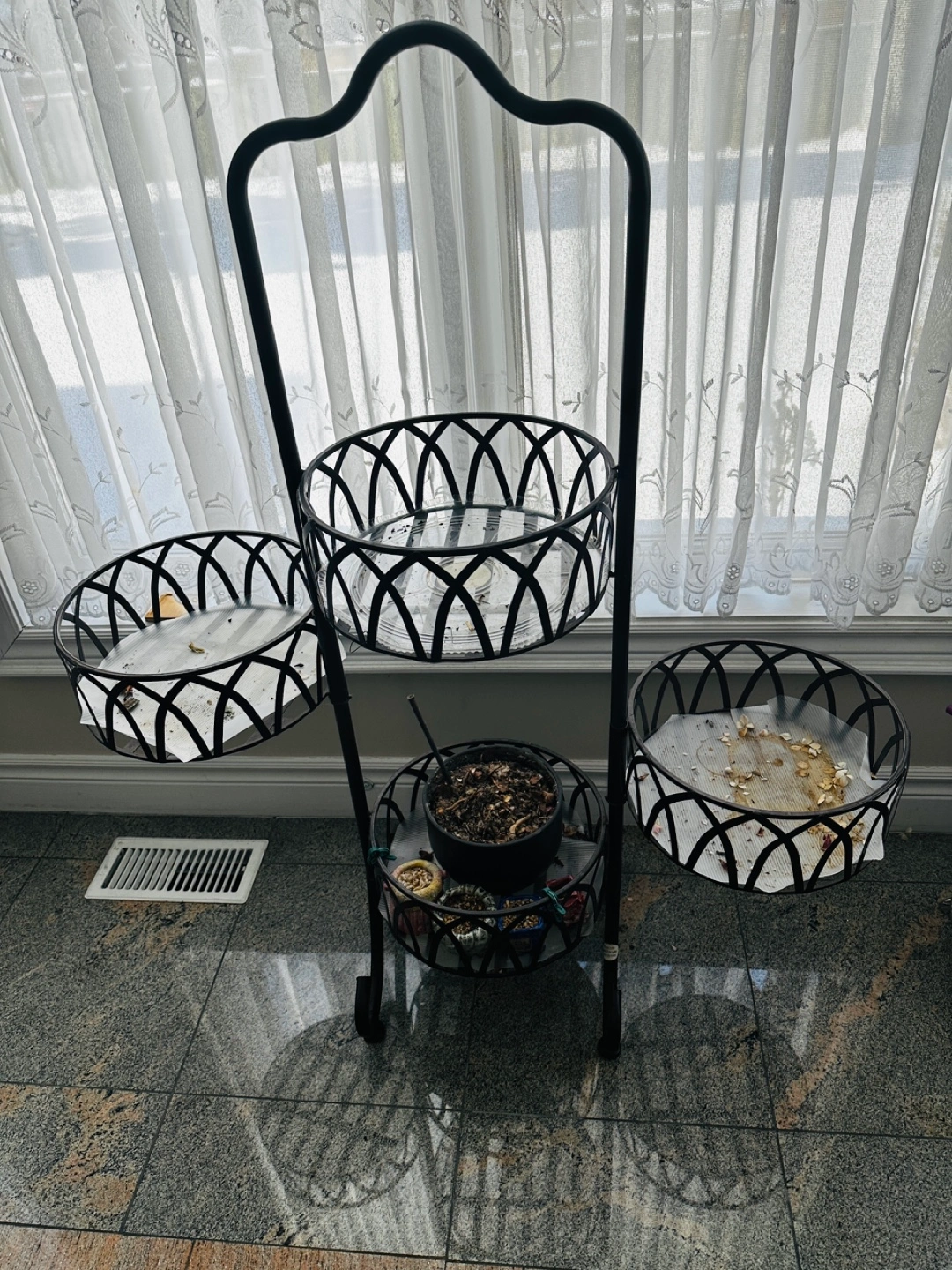 Three-tiered plant stand. Black metal frame. Rolling casters. Circular wire baskets. Great for indoor plants or gardening.