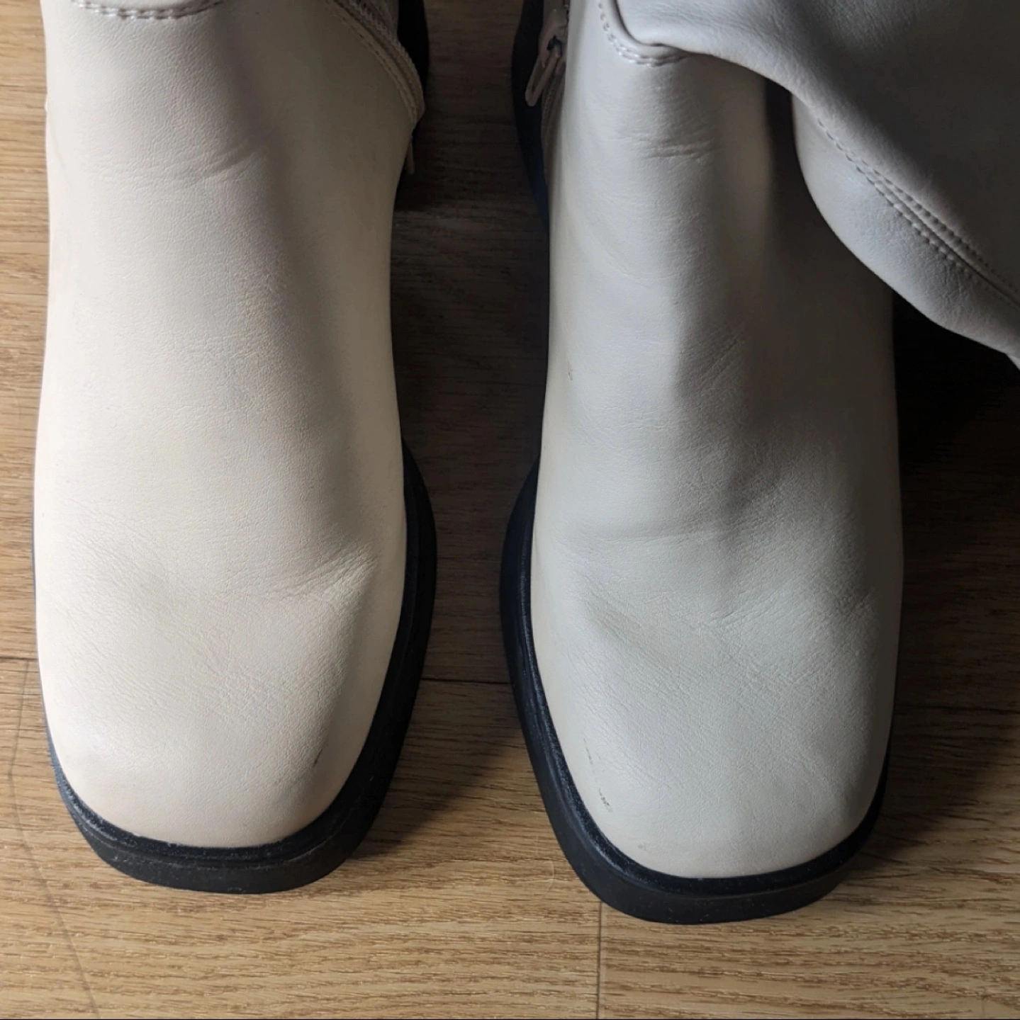 cream-coloured knee-high boots with a chunky block heel and side zipper. lightly used and small markings on the toes