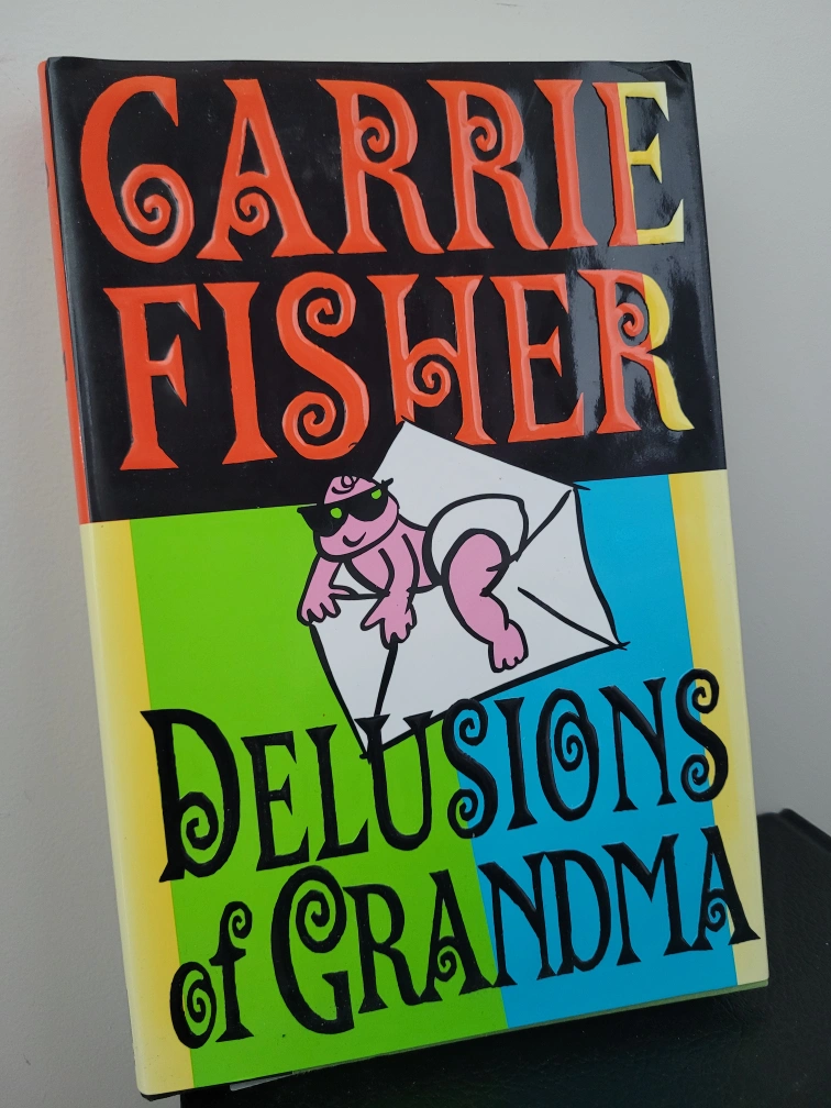 Hardcover book. Carrie Fisher's Delusions of Grandma. Features colourful cover art.