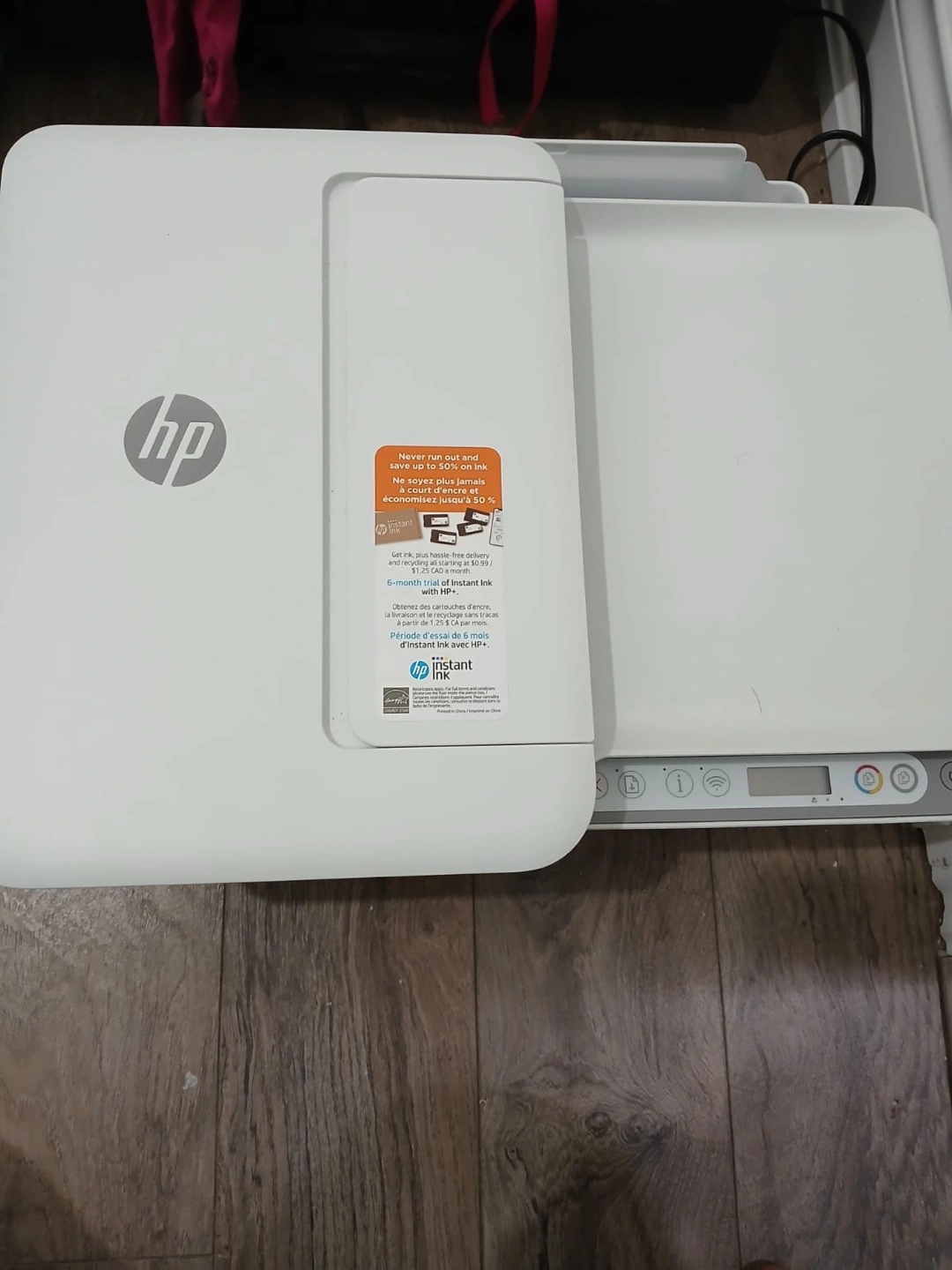 Wireless all-in-one printer. Prints, scans, and copies. Compact design. Good for home or small office use. Includes power cord. No ink cartridges included.