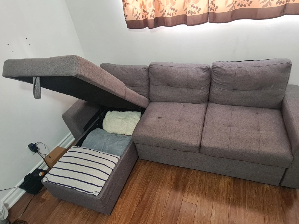 Comfortable grey fabric sectional sofa. Features a pull-out storage ottoman. Ideal for small spaces. Dimensions approximately 90" x 57" x 32".