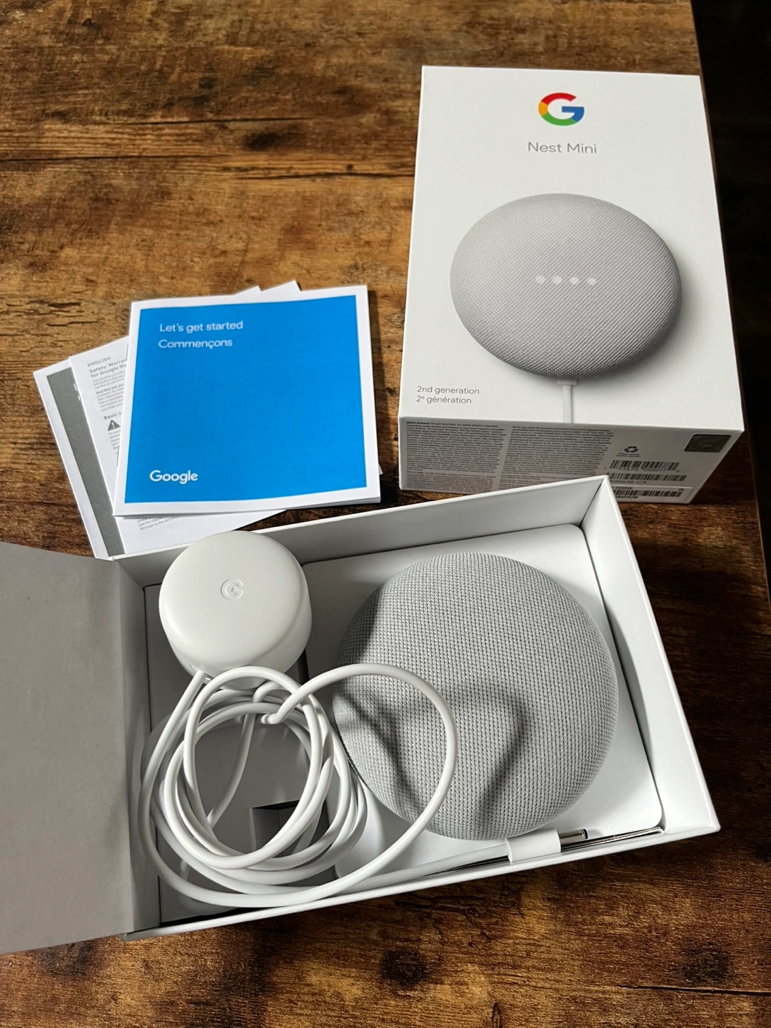 Google Nest Mini, second generation. Grey colour. Includes power adapter, charging base and instruction booklet. New, in box. Can be mounted on wall too.