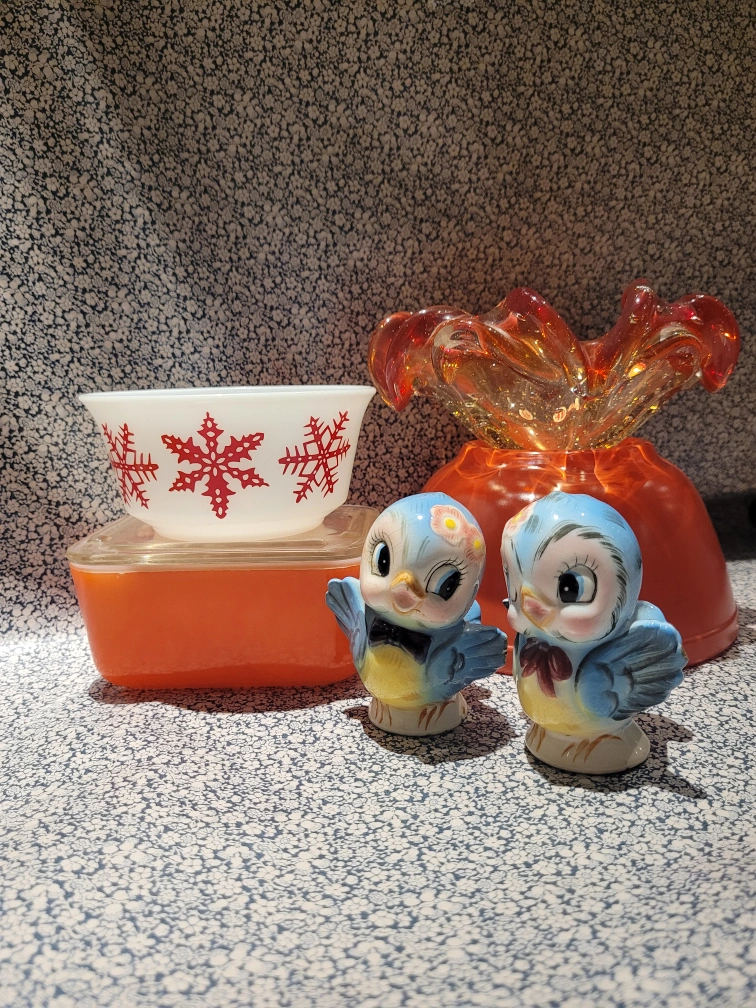 blue bird salt and pepper shaker set. some chips and crazing. asking price for the set $120. several sets on ebay sold for more. some sold on ebay for OVER 136plus37 shipping. very rare find. I had to source one out to complete the pair. i had 2 matching when their supposed to be leaning together assemtrical one boy one girl bow. fixed! now its a proper s and p set! no lowballs please .