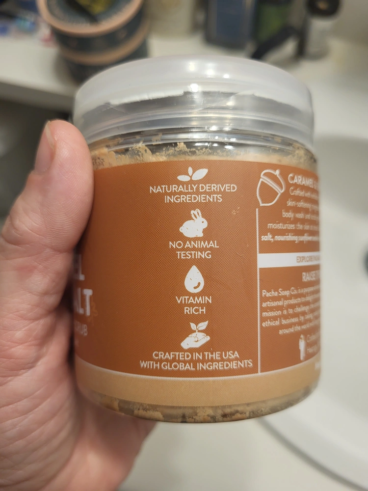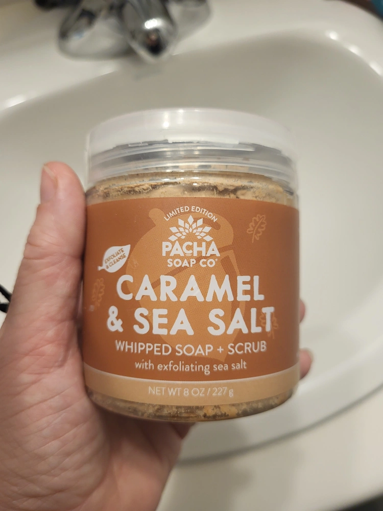 Limited edition whipped soap scrub. Caramel and sea salt scent. Exfoliating sea salt. Eight ounce jar. Naturally derived ingredients. No animal testing. Vitamin rich. Crafted in the USA with global ingredients.