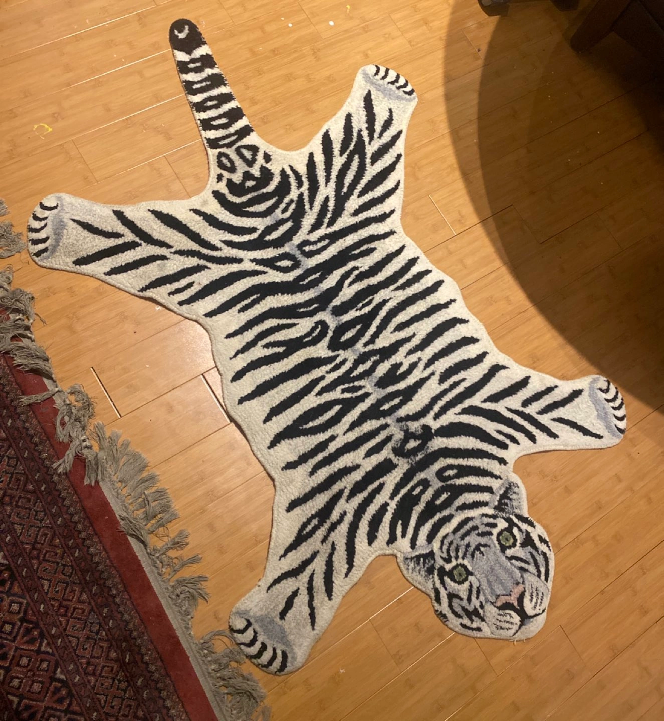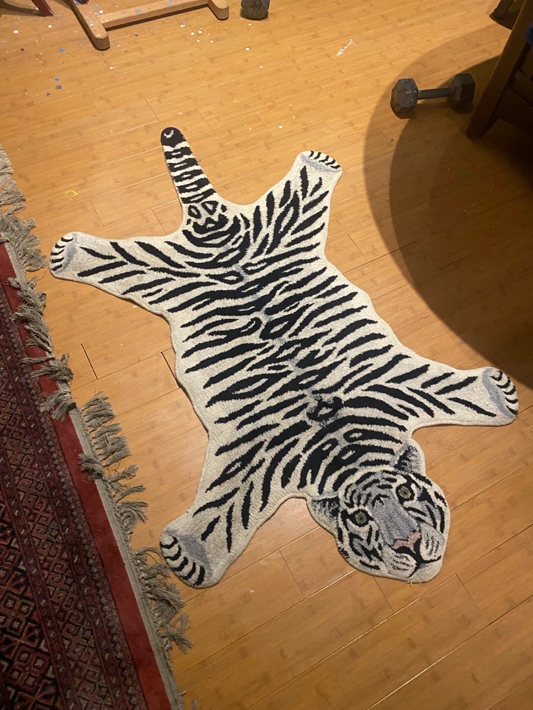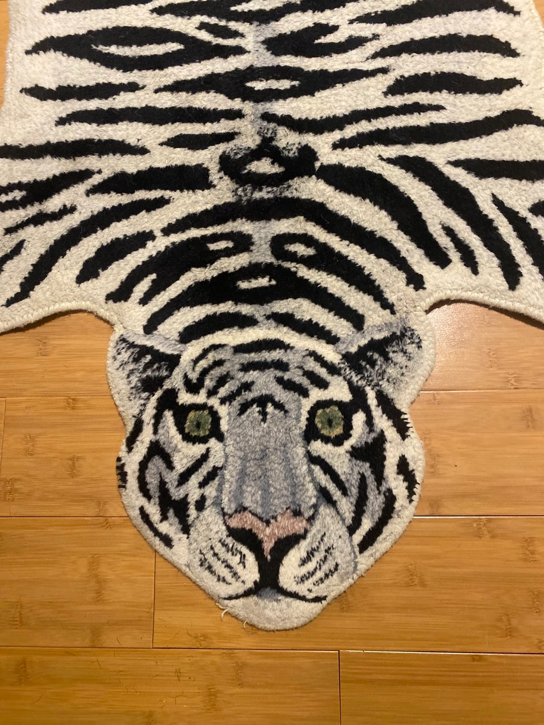 Hand tufted wool rug in the form of a white tiger. 3ft x 5ft. Looks cool anywhere. Try it!