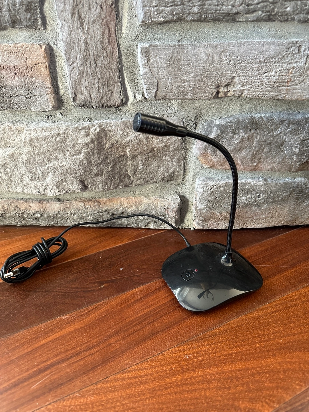 USB powered desktop microphone. Gooseneck design. Good for online meetings, recording or gaming. Includes USB cable.
