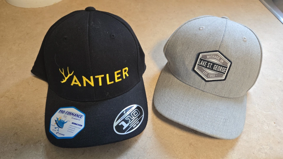 40Pair of New baseball caps. One black with yellow Antler logo, the other grey with Lake St. George patch. Both are adjustable.