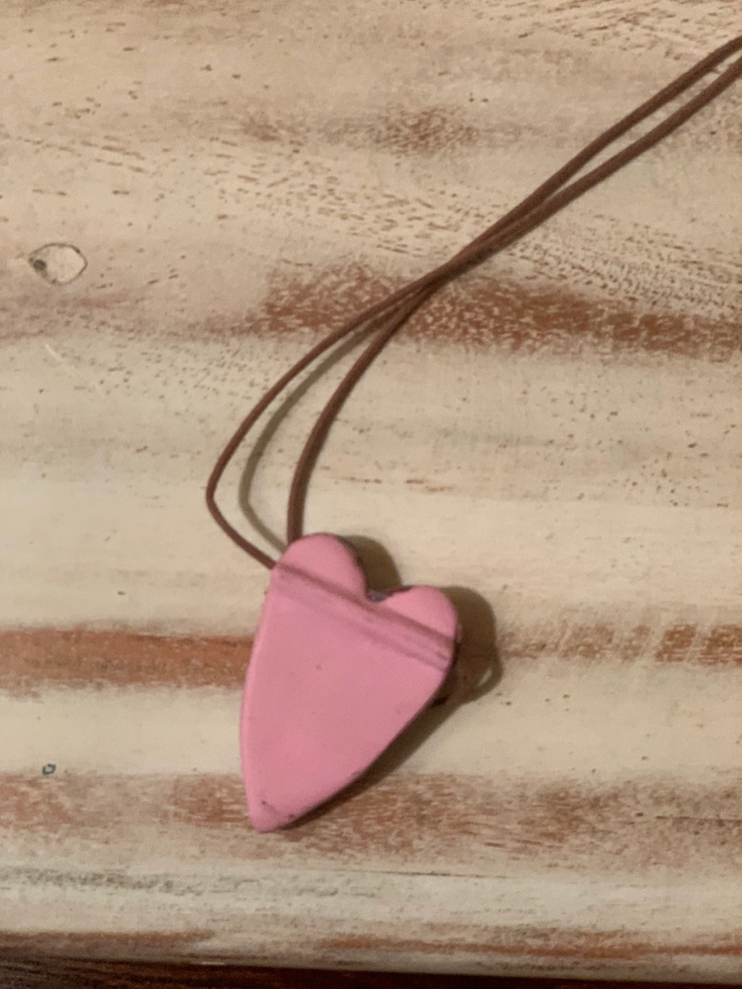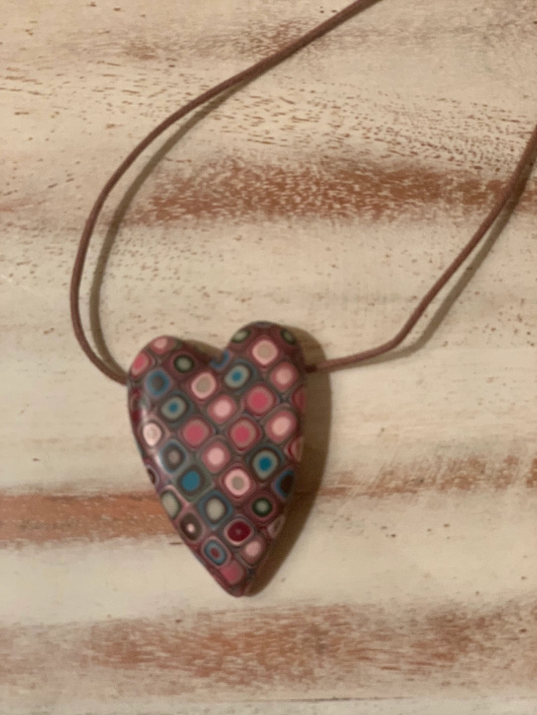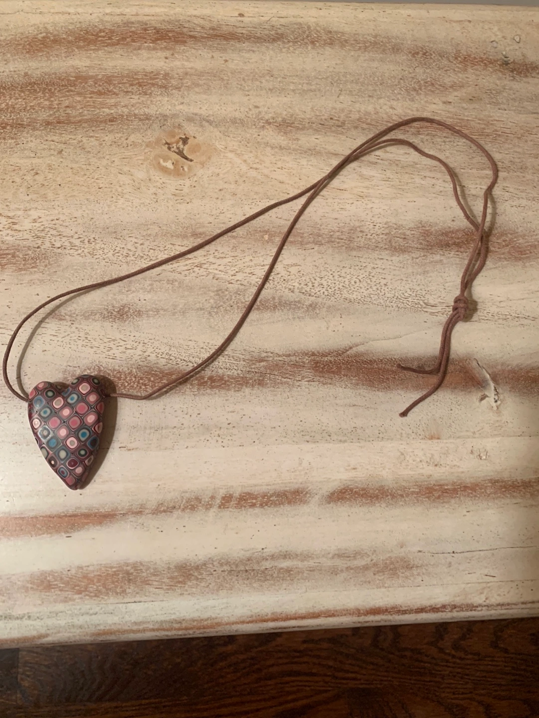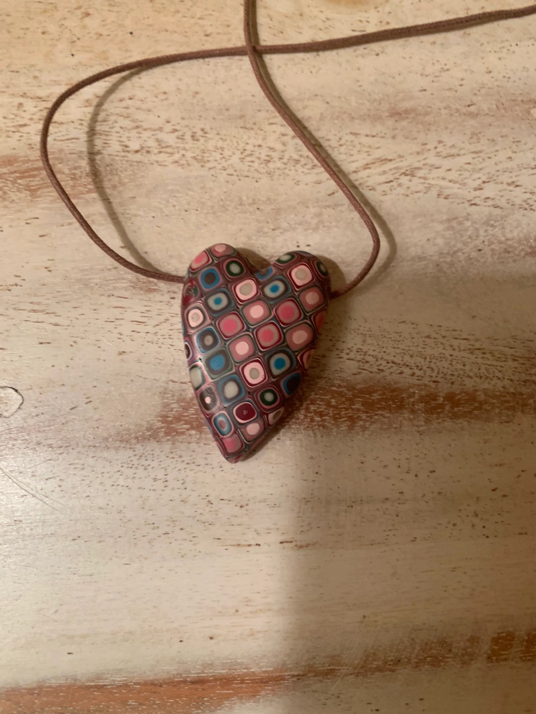 697Unique heart-shaped pendant necklace. Features a colourful geometric patterned clay heart in pinks, browns and turquoise on a brown leather cord. Lightweight and comfortable to wear. Necklace is adjustable to sit where you would like. Super cute!🩷 #winterdeclutter