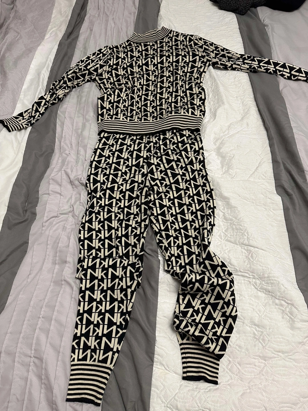 Women's black and cream MK logo loungewear set. Includes a mock neck sweater and matching pants. Soft and comfortable material. Perfect for relaxing at home.