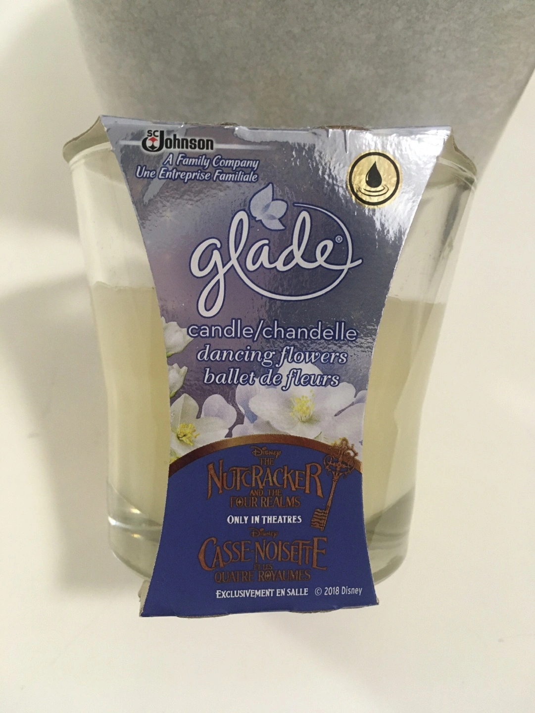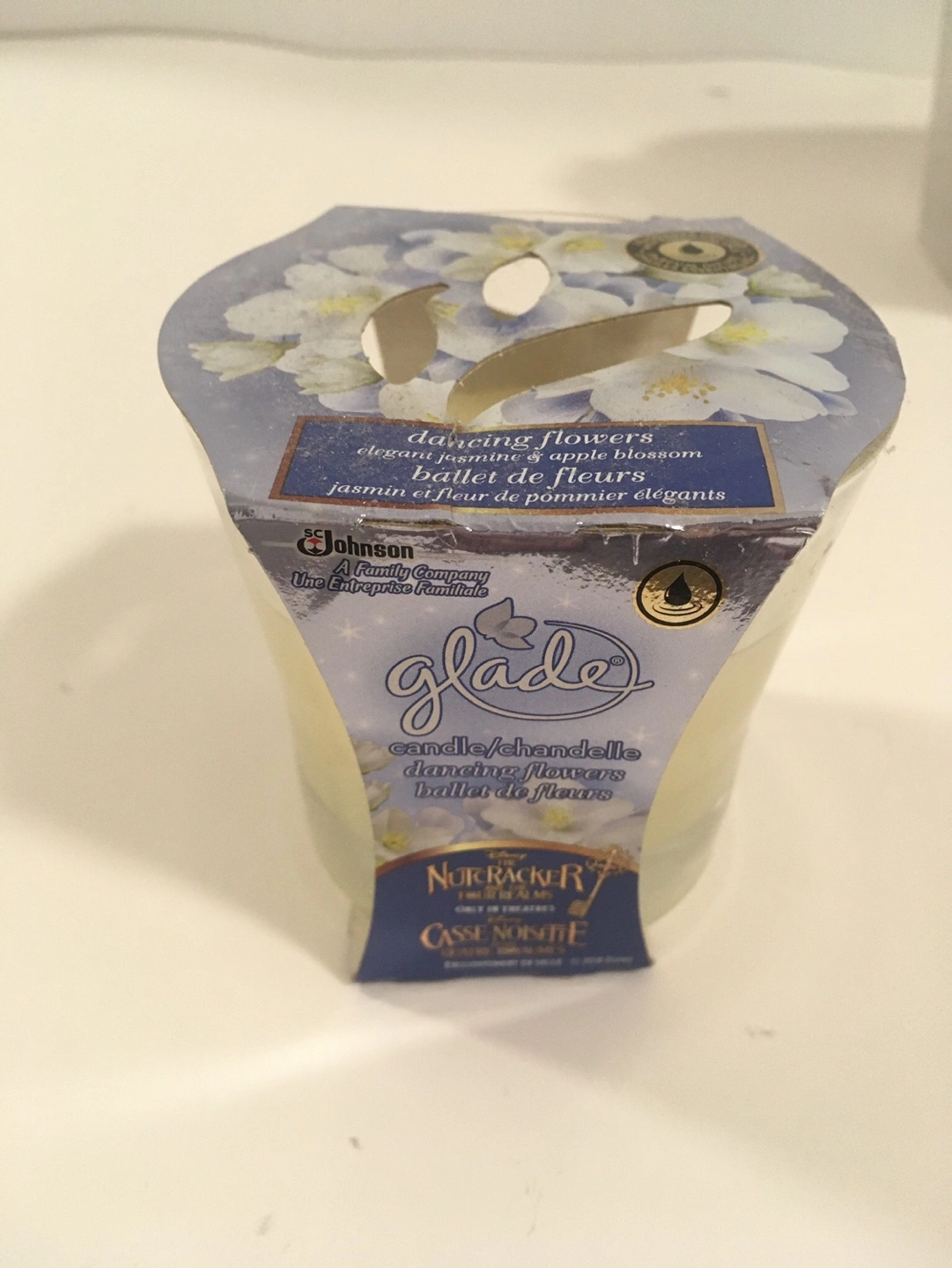 Unused Glade candle. Dancing Flowers scent. Jasmine and apple blossom fragrance. Glass container. Disney Nutcracker and the Four Realms themed packaging.