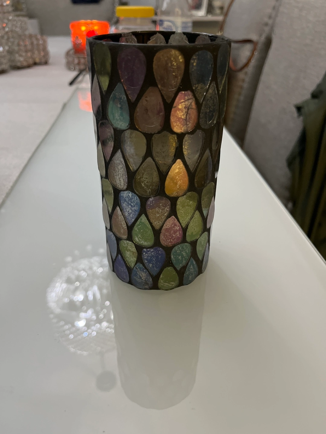 Battery-operated LED candle. Mosaic glass design. Looks great on a table or shelf. Great for adding ambiance to any room. Measures 3 x 6 inches high with new batteries
