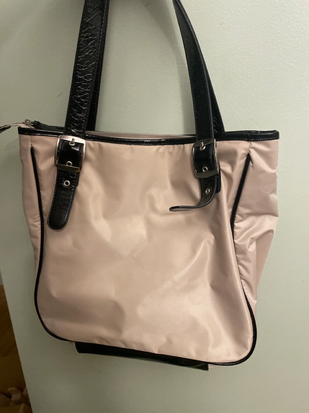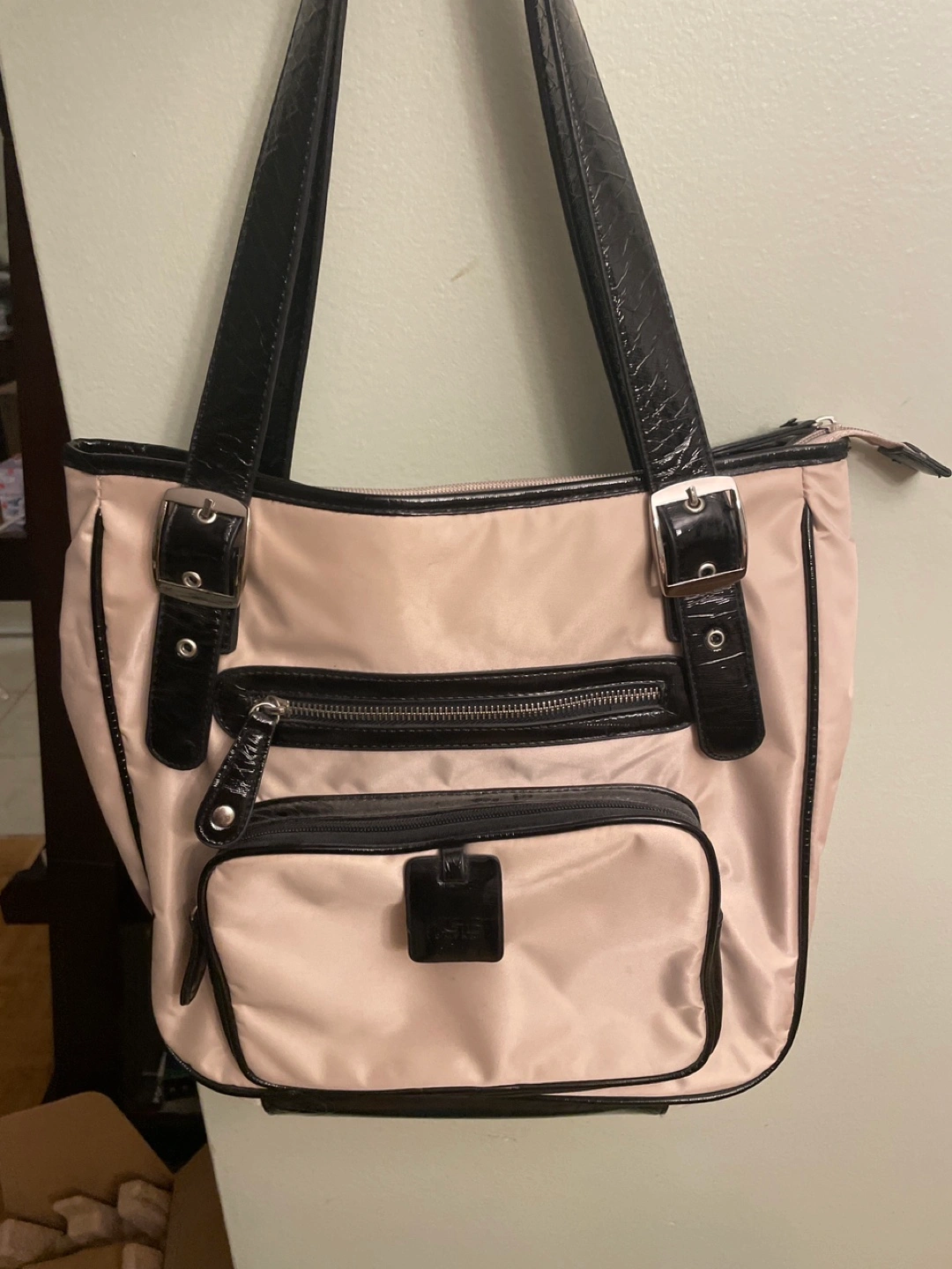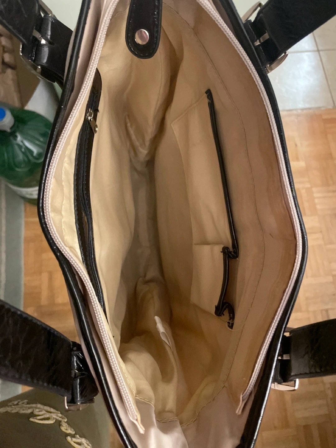 Stylish tote bag. Beige exterior with black accents. Two top handles. Multiple pockets inside and out. Zipper closure.