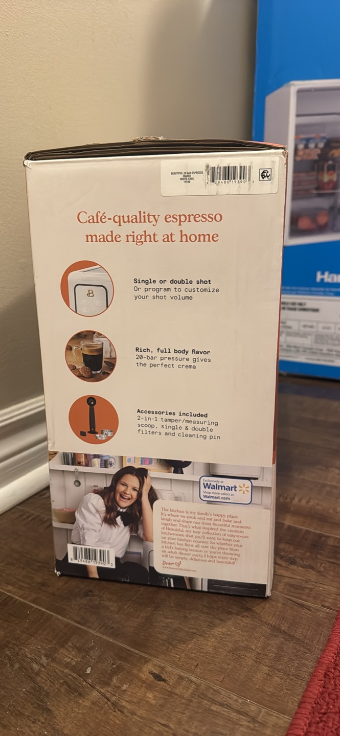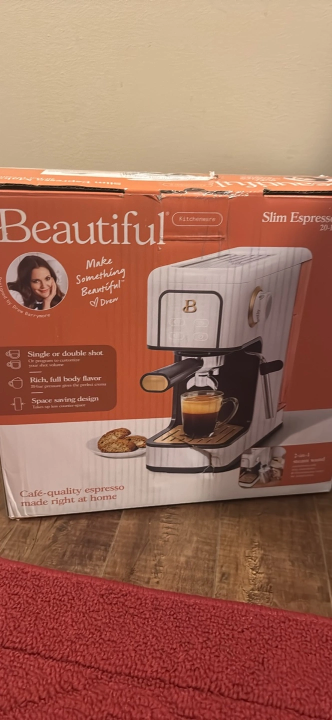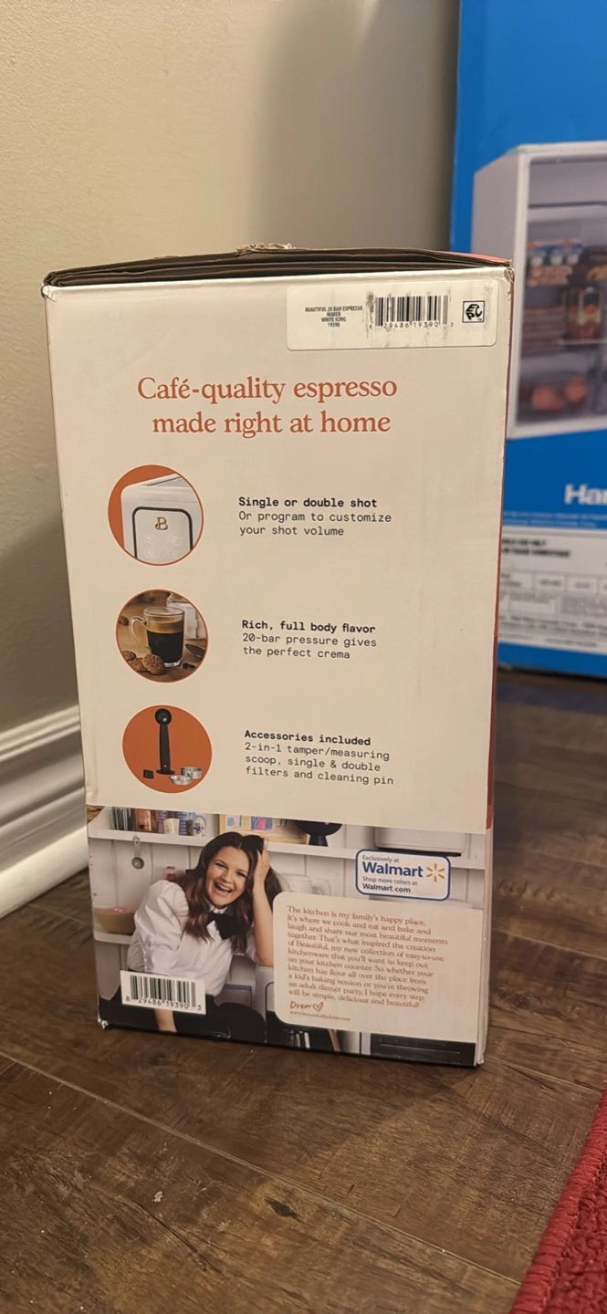 Brand new, in box. Makes café-quality espresso at home. Single or double shot options. Rich, full-bodied flavour. Space-saving design. Includes accessories: 2-in-1 tamper/measuring spoon and cleaning pin.