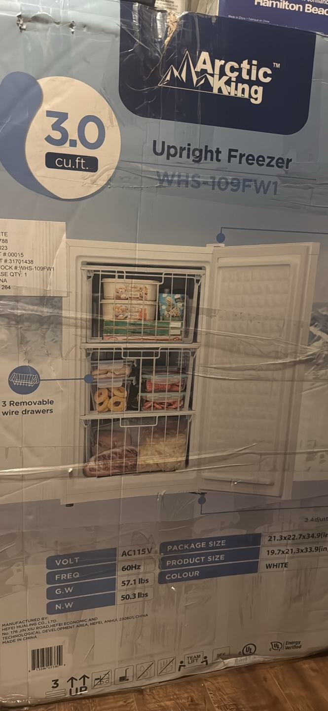 Two appliances for sale. Hamilton Beach compact refrigerator, 3.3 cubic feet. Arctic King upright freezer, 3.0 cubic feet. Both new in box.